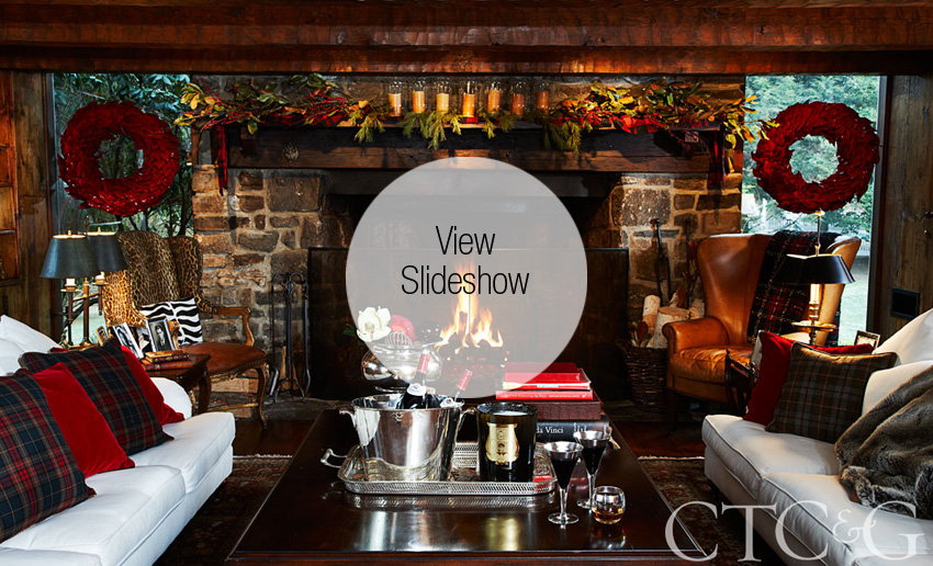 Set on five acres with a pond and groves of birch and fir trees, the home’s cozy interior—with antique wood floors, low-beamed ceilings, and two enormous fieldstone fireplaces—is the perfect backdrop for Oster’s minimalist aesthetic. “It’s naturally decorative,” she says. “One doesn’t need to gild the lily.” During the holidays, she uses fresh greens and seasonal berries, burlap garlands, decorative glass balls, and splashes of red. “The house can’t take too much gilt and glitter. But it’s so dark you have to add elements of light. The obvious choice is red,” she says.