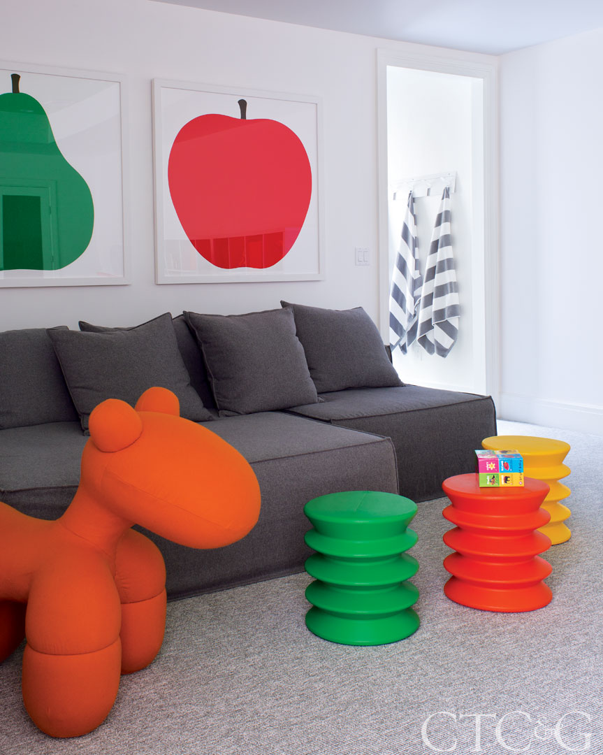 In the playroom, bright tables and Enzo Mari artwork through AllModern pop against a custom sofa upholstered in a Maharam textured linen.