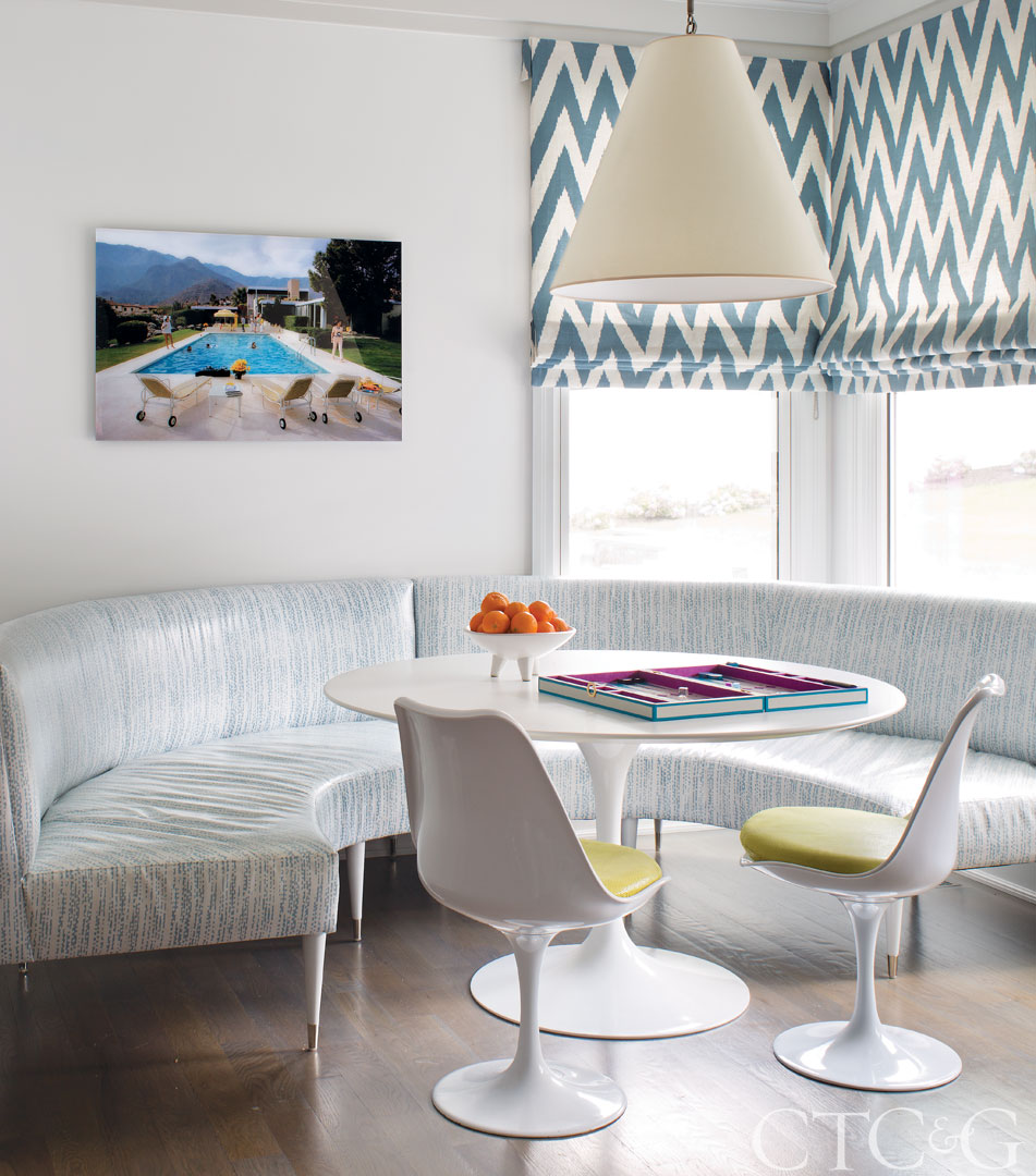 The dining room’s gray-washed oak table can seat up to 12 people. However, the family and visitors can often be found gathered around the breakfast nook with its Design Within Reach tulip table and chairs. A custom half-moon banquette sports a laminated linen by Quadrille; while an iconic Slim Aarons photograph of a Palm Springs pool adds a vintage touch. “When you are doing a house all at once, it’s important to bring in vintage elements, so the house feels perfectly layered and eclectic,” says Denise.