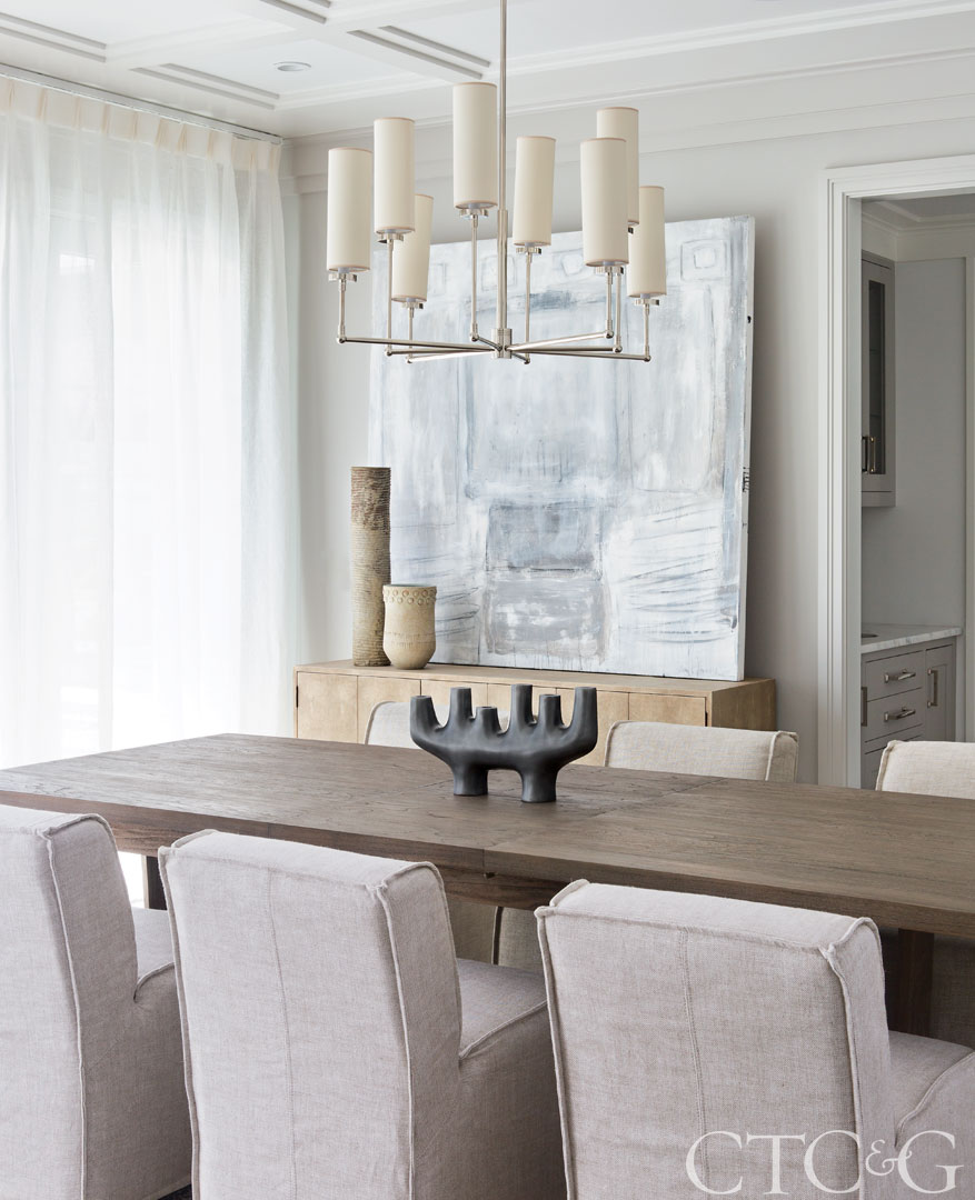 In the dining room, artwork by Kerri Rosenthal hangs above a console from Lillian August. The white oak table is also from Lillian August. Chandelier is from Circa Lighting. The midcentury pottery is a 1stdibs find.