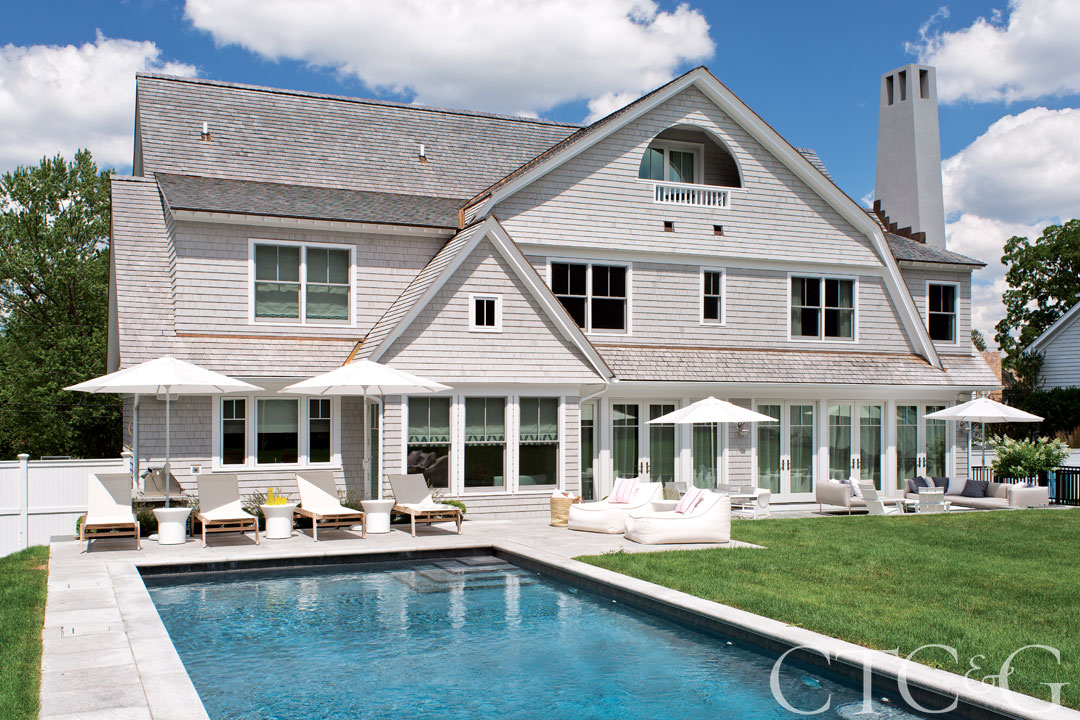 French doors lead to the home’s gracious outdoor pool area and terrace, which has umbrellas and Ibiza chairs from RH, lounge chairs from Gloster and side tables from YLiving.
