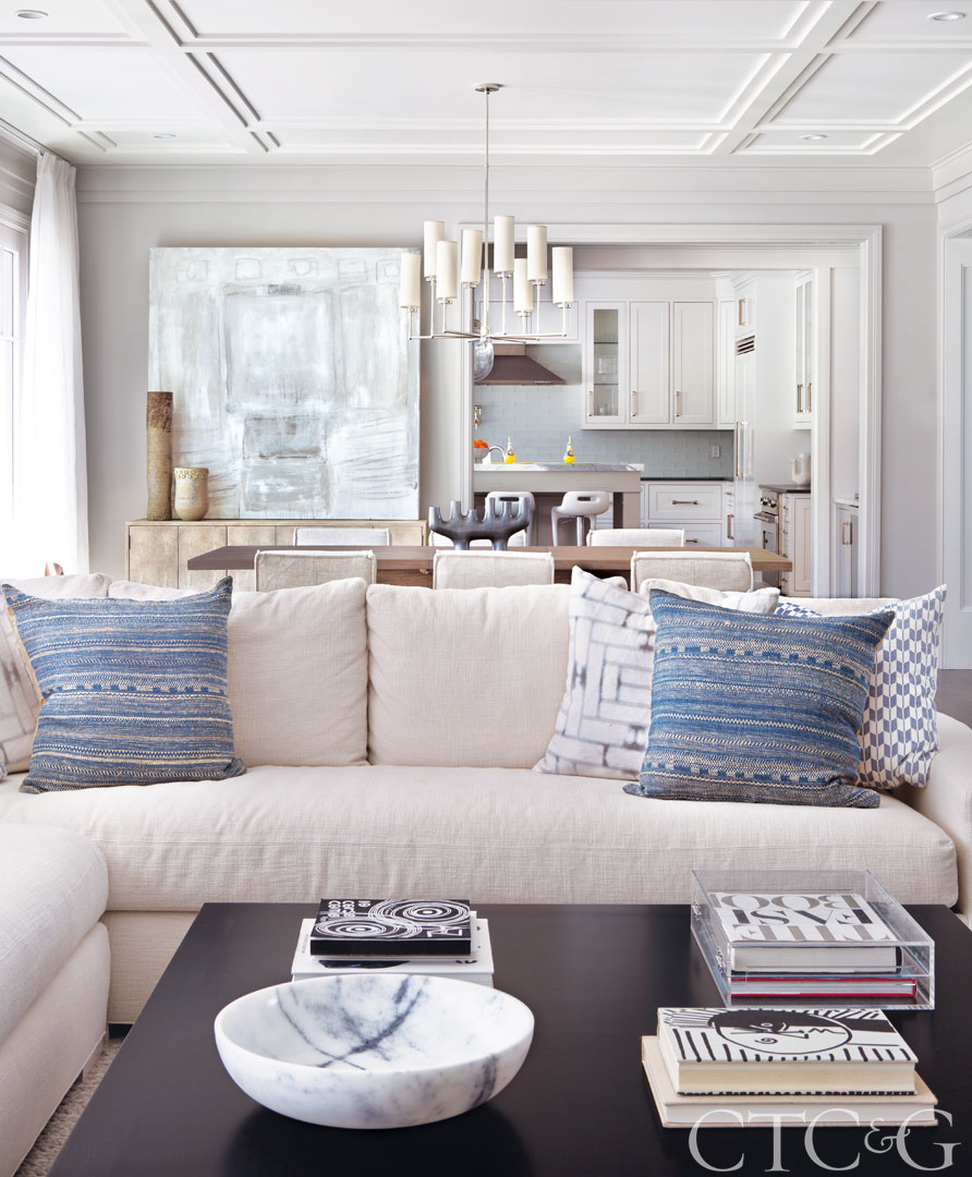 In the family room, a custom Quadrille-linen-covered sectional and an espresso-stained oak coffee table are both D2 Interieurs designs. Marble bowl is from Bungalow.