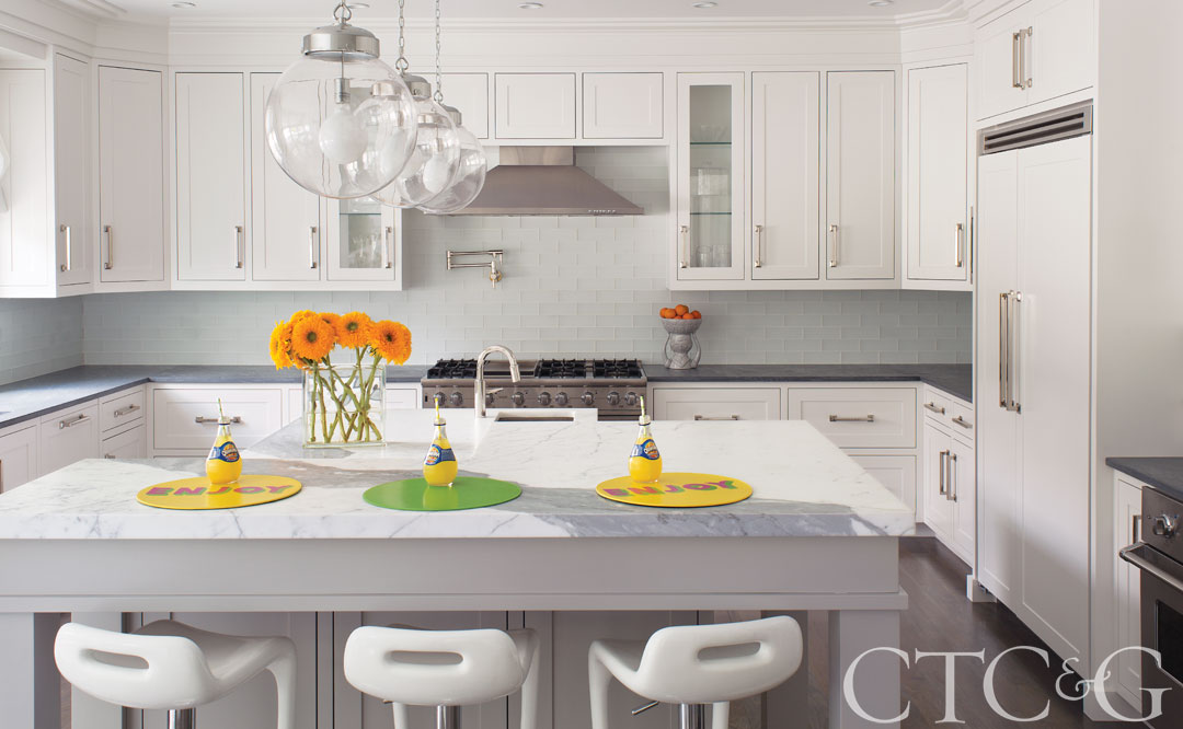 The kitchen features marble countertops from Dushi Marble & Granite and pendants from Arteriors.