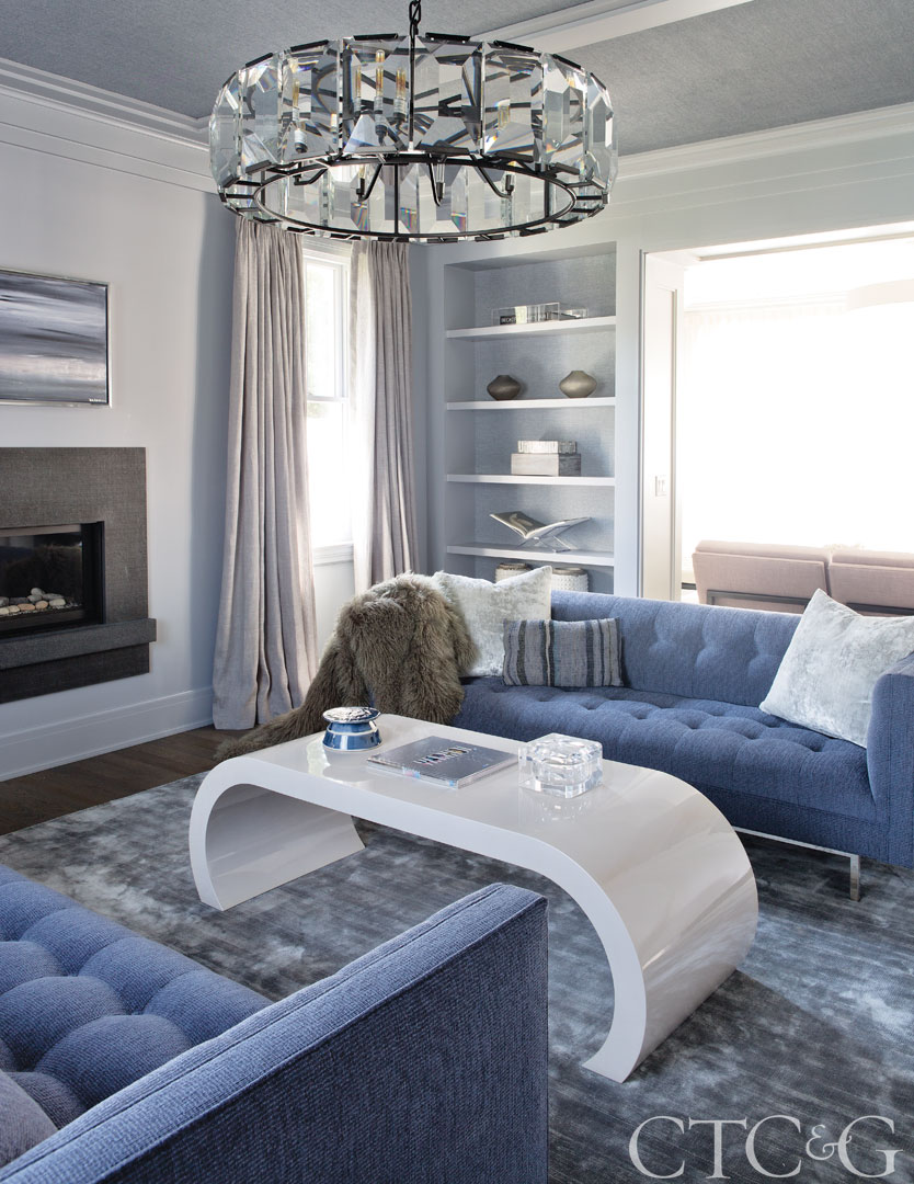 Done in a neutral palette, with pops of color and texture throughout, the interiors have a modern, relaxed feel. “The homeowners are very laid-back, and the house reflects that,” Kerri says. The open plan is conducive to family living, as are the kid-friendly fabrics and furnishings. No room is off limits, not even the formal living room done in blues and grays. Custom sofas are covered in a textured wool that is virtually indestructible, and the lacquer coffee table has forgiving, curved lines. “Their little boy can feel comfortable jumping on the sofas,” says Denise. “And Mom can have peace of mind knowing he won’t hurt himself.”