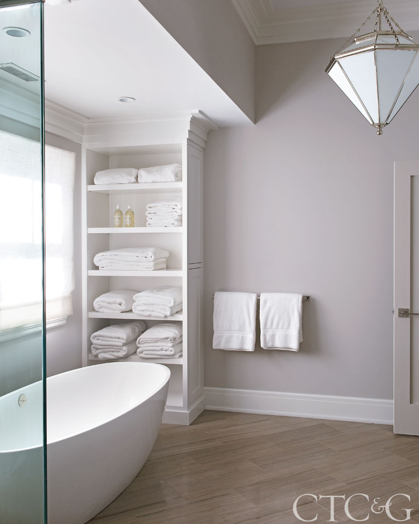 In the adjoining master bathroom, the overhead pendant is Ralph Lauren through Circa Lighting; towels are Matouk through Fig Linens. The Barcelona tub is from Plimpton & Hills.
