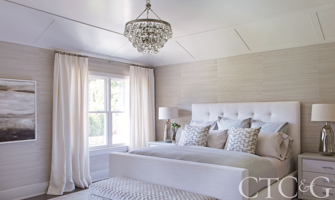 A Robert Abbey ceiling fixture draws the eye upward in the master bedroom, which has walls wrapped in Phillip Jeffries grasscloth and Nobilis textured linen window panels. Flowers from the Flowerfall top one of the nightstands from Plantation. Bench is covered in a Schumacher velvet.