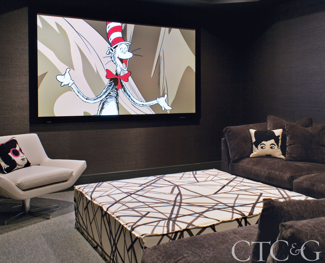 The walls of the media room are covered in a Phillip Jeffries grasscloth. The ottoman sports a Kelly Wearstler design, while the sofa is done in a Pollack flannel. Throw pillows are from Jonathan Adler.
