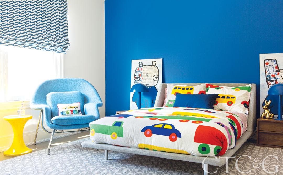 Bedding is in a classic Marimekko design. Mushroom lamps are from Schoolhouse Electric & Supply; chair is from Design Within Reach. David Hicks rug is through Stark.