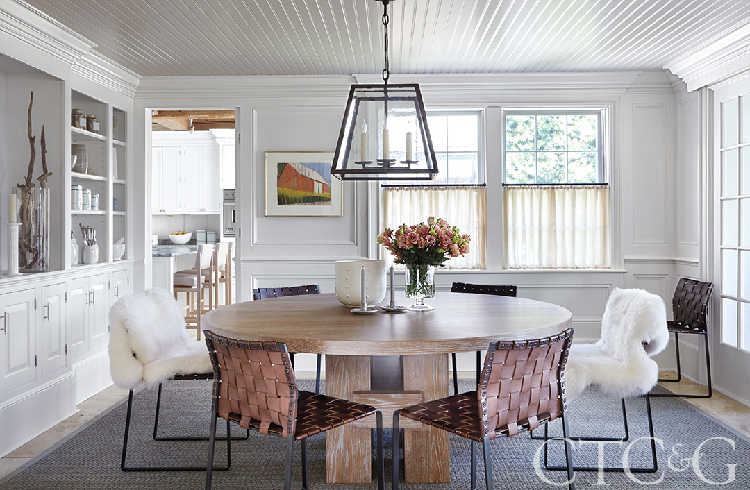 Texture takes center stage in the dining room where every piece—from the cerused oak table, “a favorite of mine because of the depth it gives to the wood finish,” to the woven leather chairs—was selected to complement the metal chandelier. Shearling throws on the chairs are flirtatious, and the pale blush color on the ceiling adds a hint of femininity.