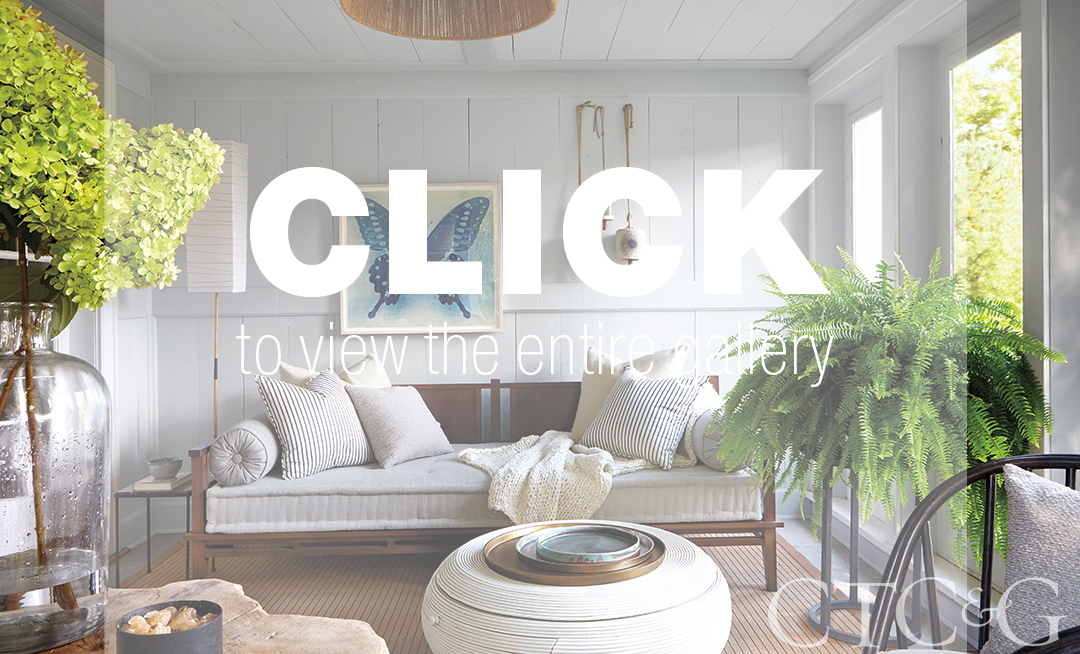 Throughout the spaces, the furnishings feature a mindful melding of textures, shapes and Dumais’ signature genre blending, the latter punctuated with midcentury modern interjections. “I’m driven to midcentury pieces, and bringing them together with other items is something I have developed over the course of my career,” says the designer, who added French bleached-oak club chairs, circa 1970, alongside a woven side table, and a George Smith chair and ottoman swathed in a bold botanic fabric in the living room. In the entry, a Saarinen side table meets a traditional antique bench; and on one of two screened porches, a daybed with Asian lines, a vintage rattan table, and a live edge side table all happily coexist.