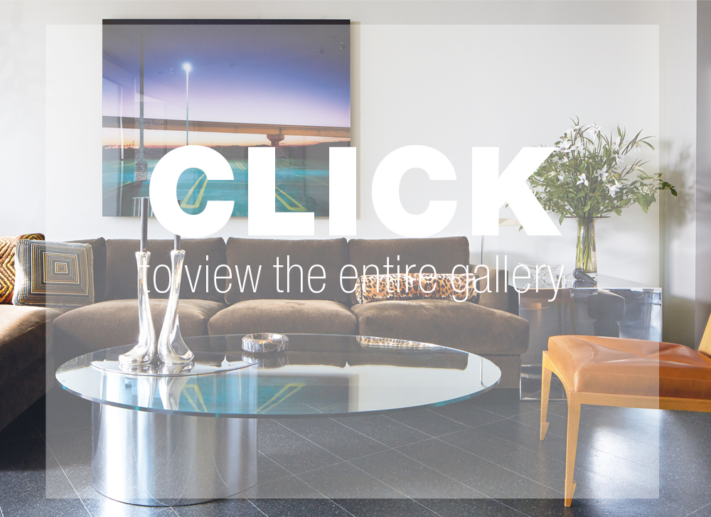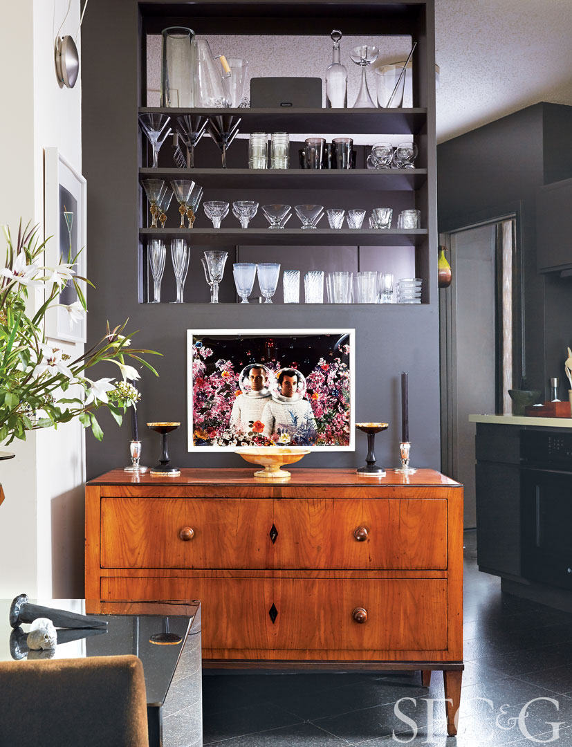 His scholarship and fine art background—Hutton studied at UC Davis with Wayne Thiebaud, Robert Arneson and Manuel Neri—have made him a go-to designer for art aficionados. In his own home, Hutton’s conceptual sensibility is evident in his collection, which includes works from masters like Donald Judd as well as contemporary artists like Pierre et Gilles. A favorite photograph above the living room sofa by Johnna Arnold depicts the Ikea parking lot in Emeryville where the artist sits in a shopping cart. “To me, it illustrates the intersection of people and manmade landscape,” notes Hutton. “It’s about understanding one’s relationship to the world. As individuals we are all small little entities in a vast universe.”