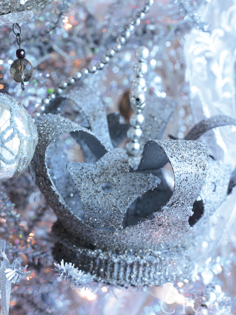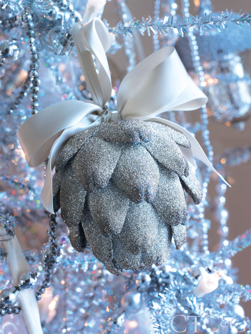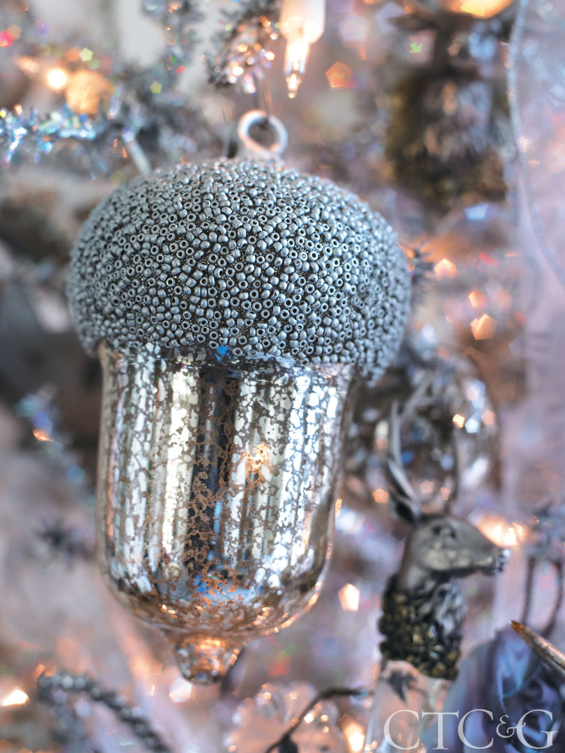 Beaded silvery acorns are among the hundreds of ornaments that bedeck the all-silver tree.
