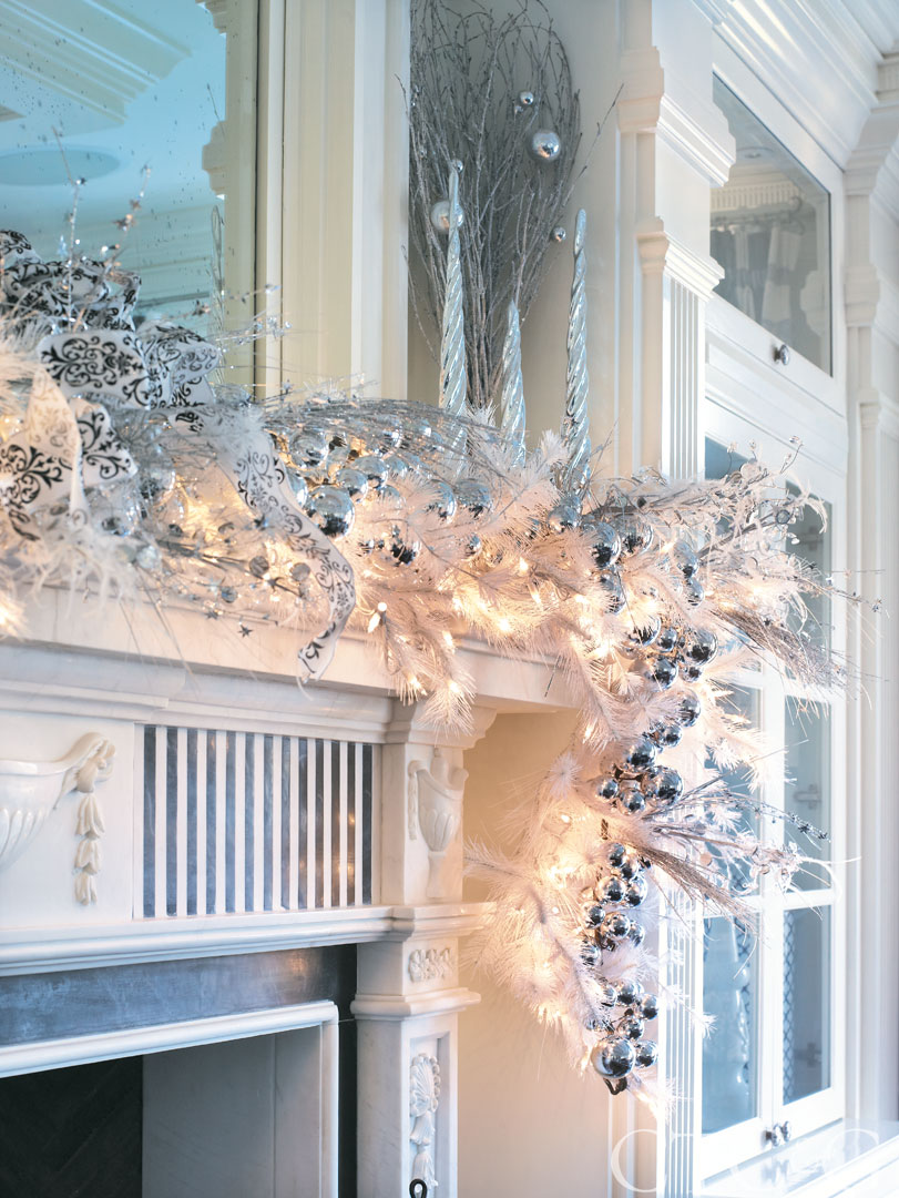 In the family room, the mantel is overflowing with white boughs, silver balls and branches, and tiny white lights.