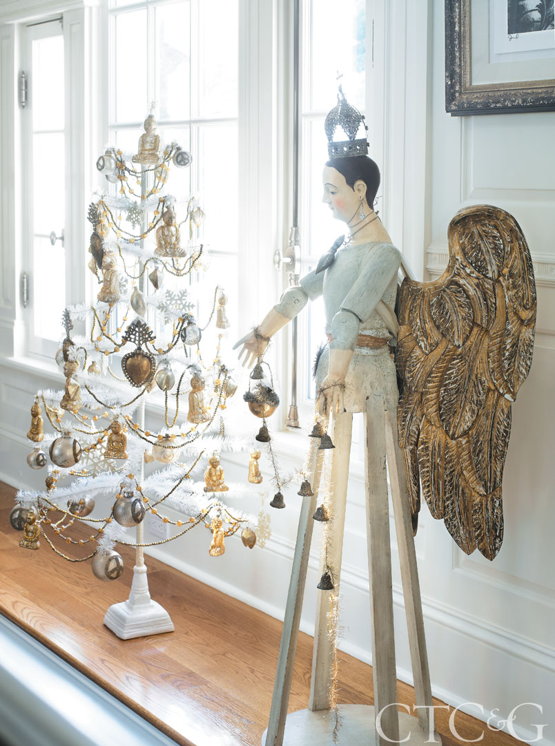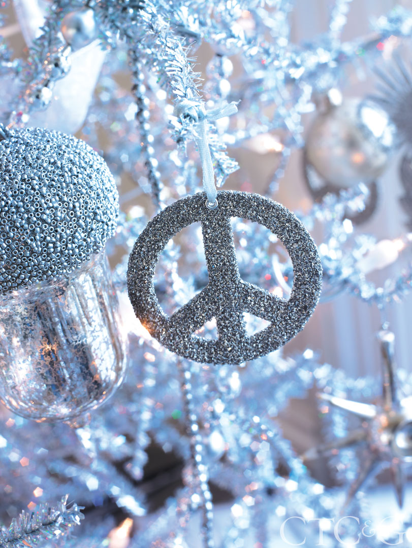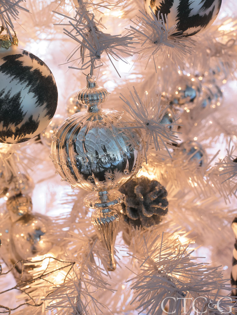 Decorator Maggie Hornung’s silver tree was inspired by an abundance of vintage-style silver, glittering ornaments and garlands of tiny silver beads. The tree graces the hallway that leads from the kitchen to the family room.