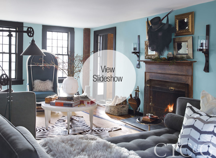Robison, who designs interiors for clients throughout Connecticut, Westchester County and the Hudson Valley, and DeBerry, who works as a school-system administrator, both hail from Texas. “Trent is from Austin and I’m from West Texas, the middle of nowhere, where there’s lots of cacti and sand,” says Robison. “I blocked out much of my childhood because I felt so out of place there.” Robison seems to have reinvented himself through the home and objects he and DeBerry live among. When they purchased this home two years ago in August, they managed to remove the unsightly details, move in and choreograph all of their goods, paint the interiors in varying depths of gray, and have it fully decorated in time for Christmas. “I’m a maniac like that,” admits Robison.