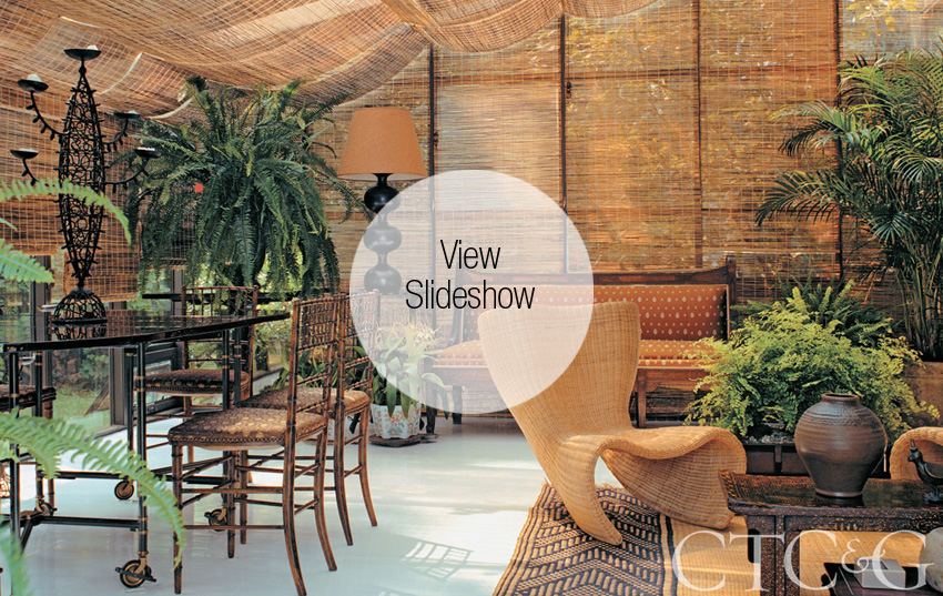 For my 40th birthday, by husband, Nuno, surprised me with two adjoining plots of land in Hampton Bays, overlooking Peconic Bay. The view was breathtaking, but the two houses on the property were dismal. Each one had distinct challenges to overcome. The main house was an angular modernist box from the 1970s, with a prefabricated glass structure tacked onto the side. The floors were an odd mix of marble and terra cotta, which I replaced with wood that I lacquered a high-gloss white. Instead of fighting the irregularly shaped walls, I accentuated their geometry by covering them with broad, bold stripes. As for the glass section, I hid the ugly aluminum framing behind split-bamboo shades and turned the whole thing into a greenhouse layered with plants and tropical blooms. On summer evenings we light candles and feel as if we are enjoying dinner in a rainforest.