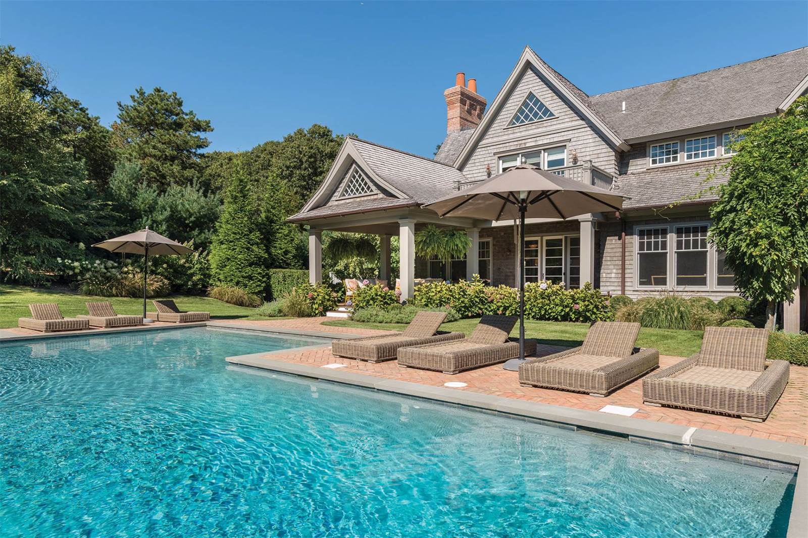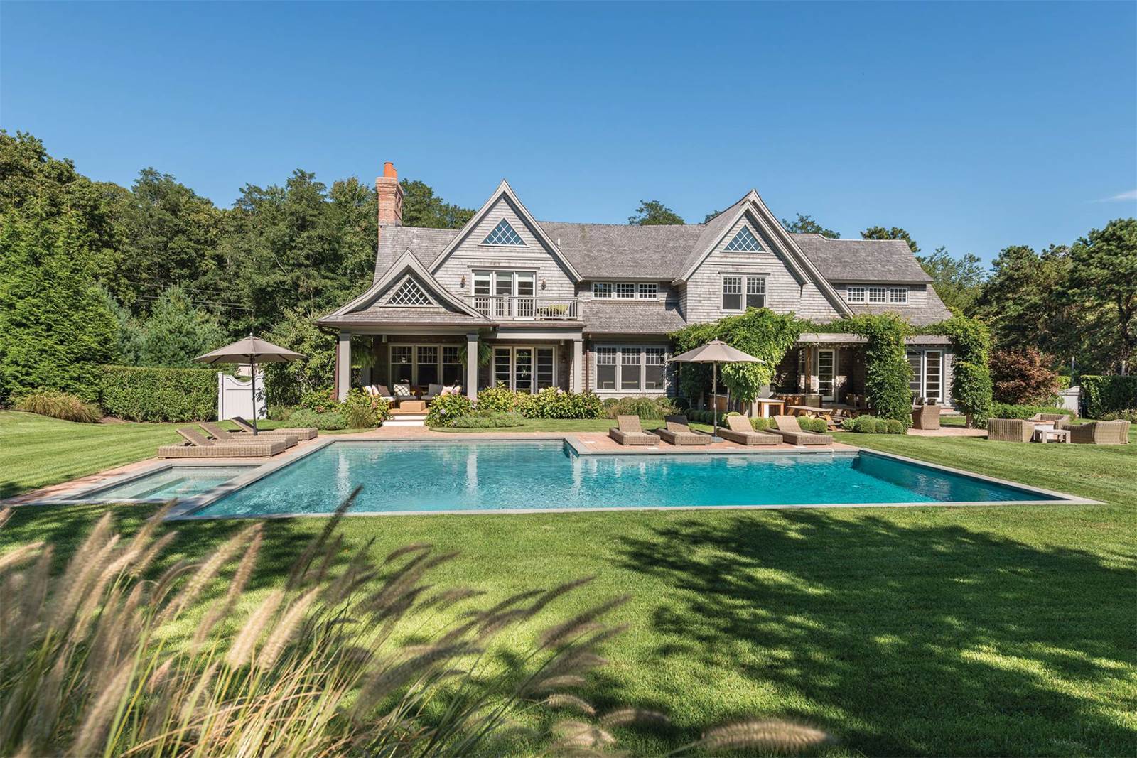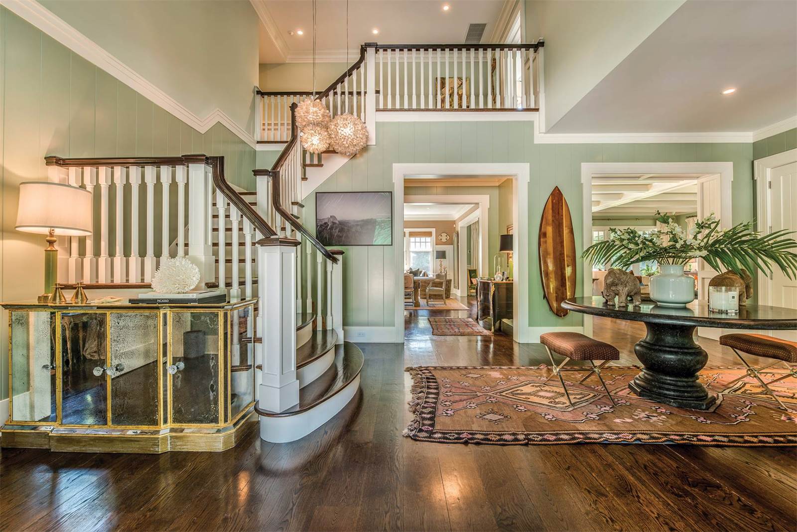 Custom-designed for entertaining and featuring interiors by Nate Berkus, the 6,500-square-foot home has a spacious formal living room with a fully outfitted wet bar, a lower-level recreation room and a home theater. The light-filled open kitchen and breakfast room is appointed for a professional chef and there is an additional outdoor kitchen with a pizza oven, barbecue and refrigerator. The home sits on 2 acres, which are designed for outdoor entertaining with covered terraces, a fire pit and a heated pool.