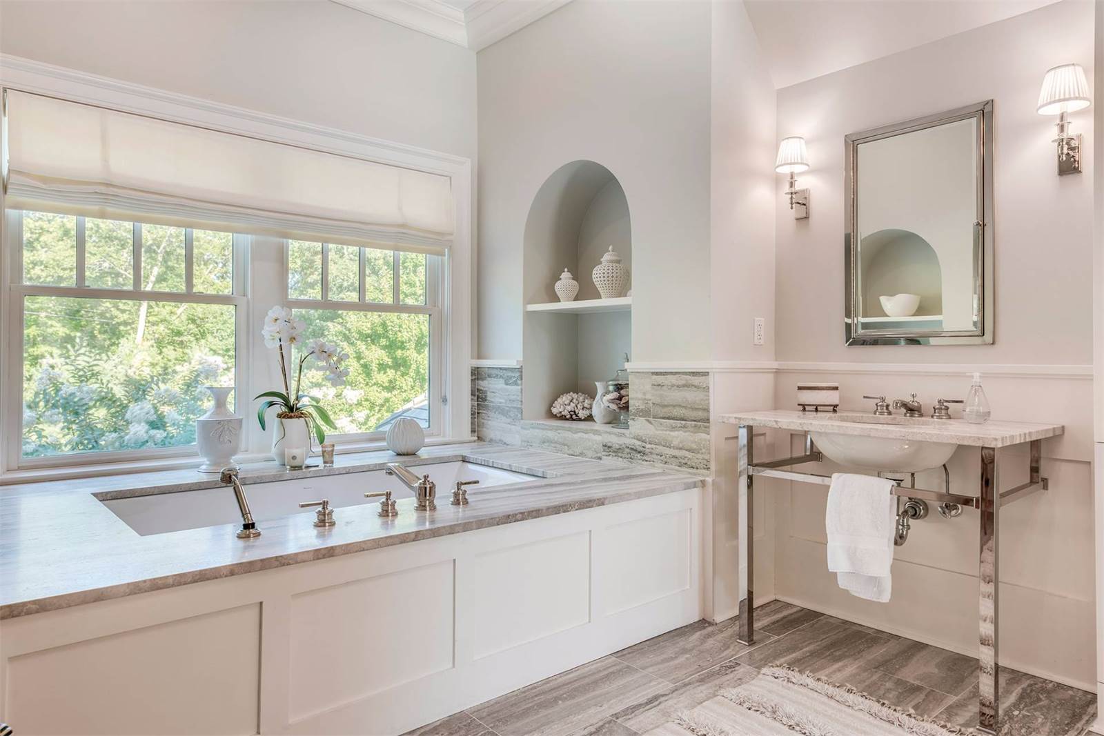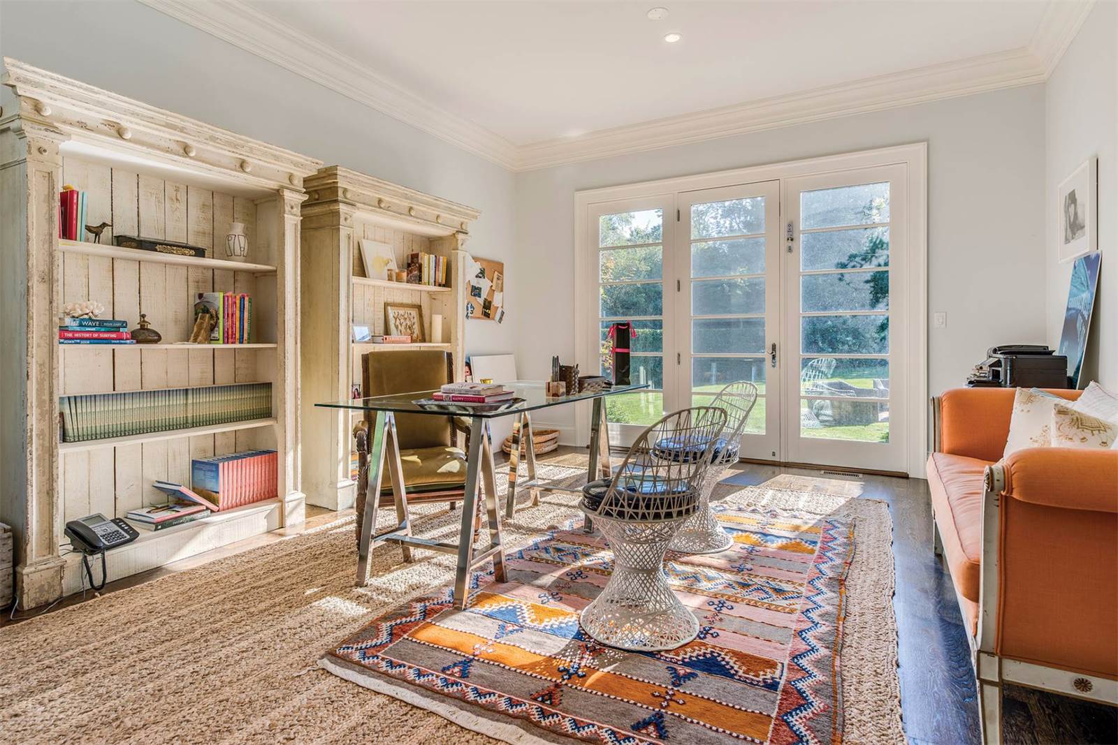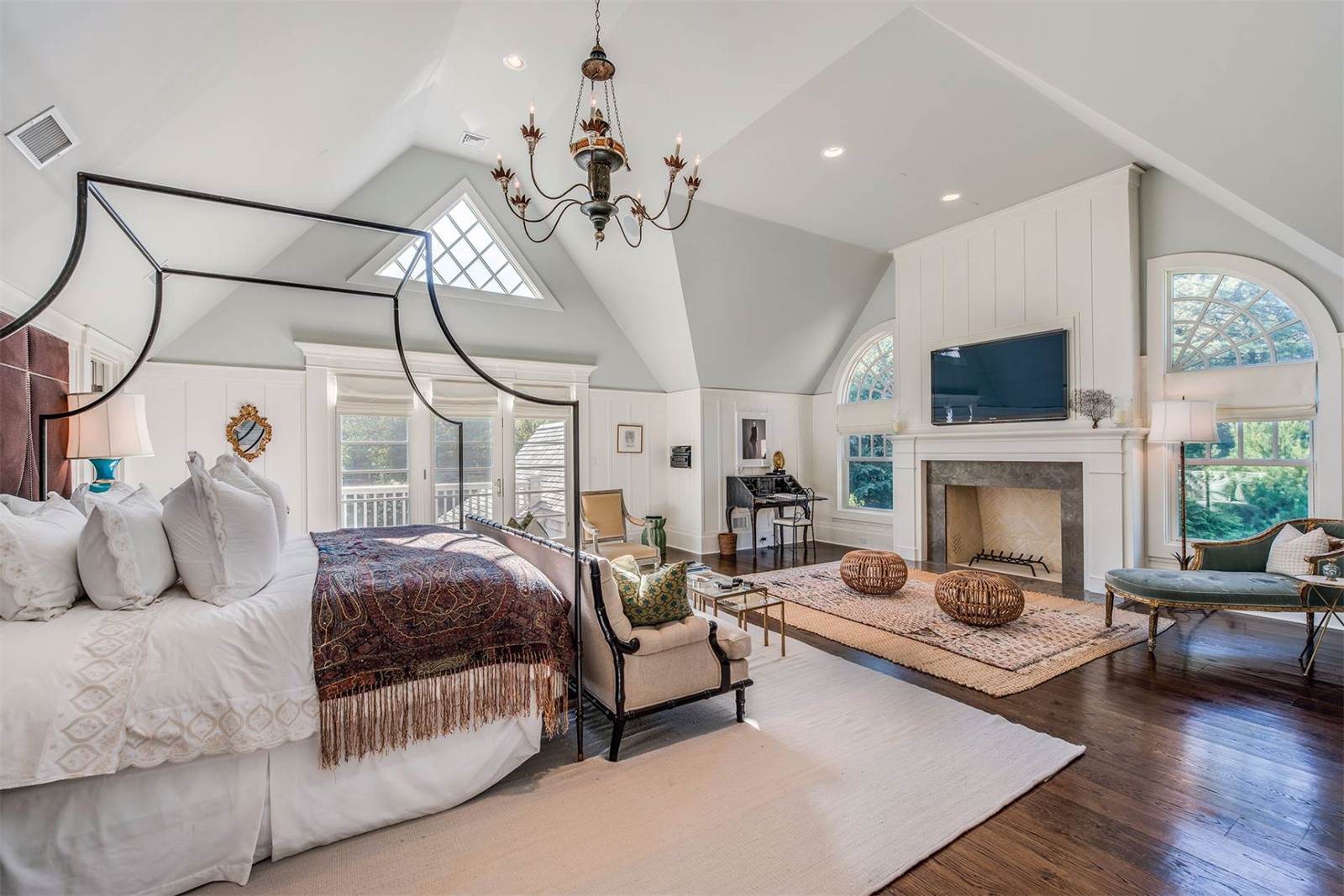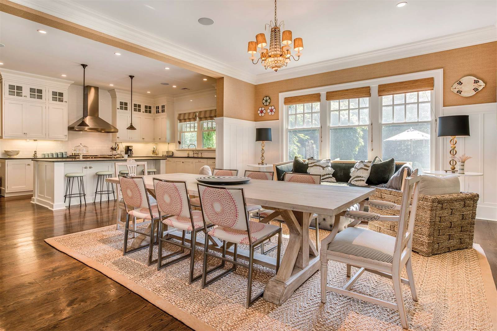 Custom-designed for entertaining and featuring interiors by Nate Berkus, the 6,500-square-foot home has a spacious formal living room with a fully outfitted wet bar, a lower-level recreation room and a home theater. The light-filled open kitchen and breakfast room is appointed for a professional chef and there is an additional outdoor kitchen with a pizza oven, barbecue and refrigerator. The home sits on 2 acres, which are designed for outdoor entertaining with covered terraces, a fire pit and a heated pool.