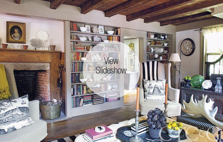 Her Connecticut cottage is a perfect illustration of this philosophy. Although the first impression is one of stepping back in time, something slightly unexpected appears in almost every room. A Doric column topped with a bronze finial stands just inside the front door—a salvaged bit of classical architecture contrasting with the interior’s rustic simplicity. In a living room with hand-hewn ceiling beams and a primitive pine mantel, a black-and-white striped carpet provides an island of contemporary style. Slightly brighter than the pea-green shade popular in colonial America, chartreuse curtains add another up-to-date touch. While the English and European furniture is in sync with the house’s period, a giant, sun-bleached elk horn poised on a low stool interjects a modern, almost sculptural element. The couple’s penchant for unlikely pairings of the high and the low, the natural and the hand-crafted finds full expression in the bookcases framing the entrance to the dining room. On their shelves, books rub shoulders with antique children’s toys, coral branches and shells, porcelain bowls, wooden boxes and architectural fragments. Nearly all come from local antiques shows and flea markets. As a photographer, Street-Porter often finds inspiration in these places where, he says, “I’m always discovering compositions of things that are completely arresting because they are so unexpected and so unplanned.” The local antiques scene is equally inspiring to Kelly: “If you want to find something fresh, lively and individual, flea markets are the best places to look.”