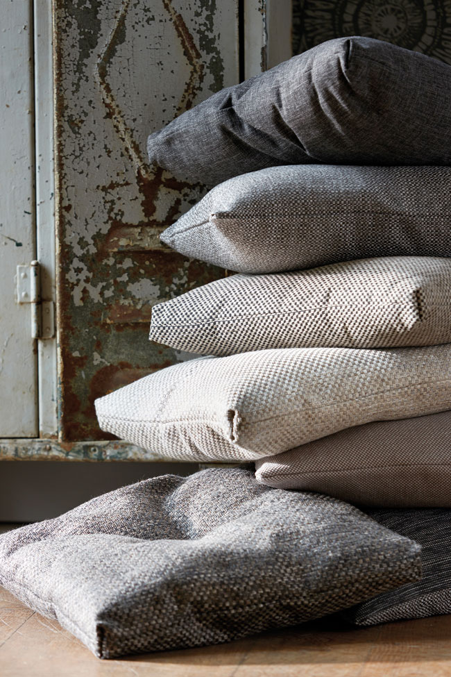 Comfy Cushions Scion’s Khalo Weaves and Texturescollection was influenced by Native American textiles and encompasses simplistic plains, checks and stripes with an organic, natural feel. From top to bottom, Fleck, Flax, Rattan, Union, Hemp and Raffia.