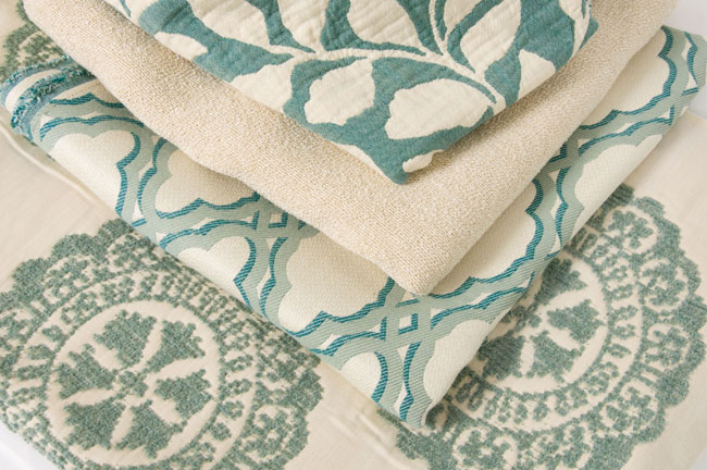 Set Sail (top to bottom) Marina Leaf in Ocean 32061-35, Bon Voyage in Sand 31939-1, Grand Entrance in Bimini 31943-13, Suzani Bloom in Bimini 32019-135