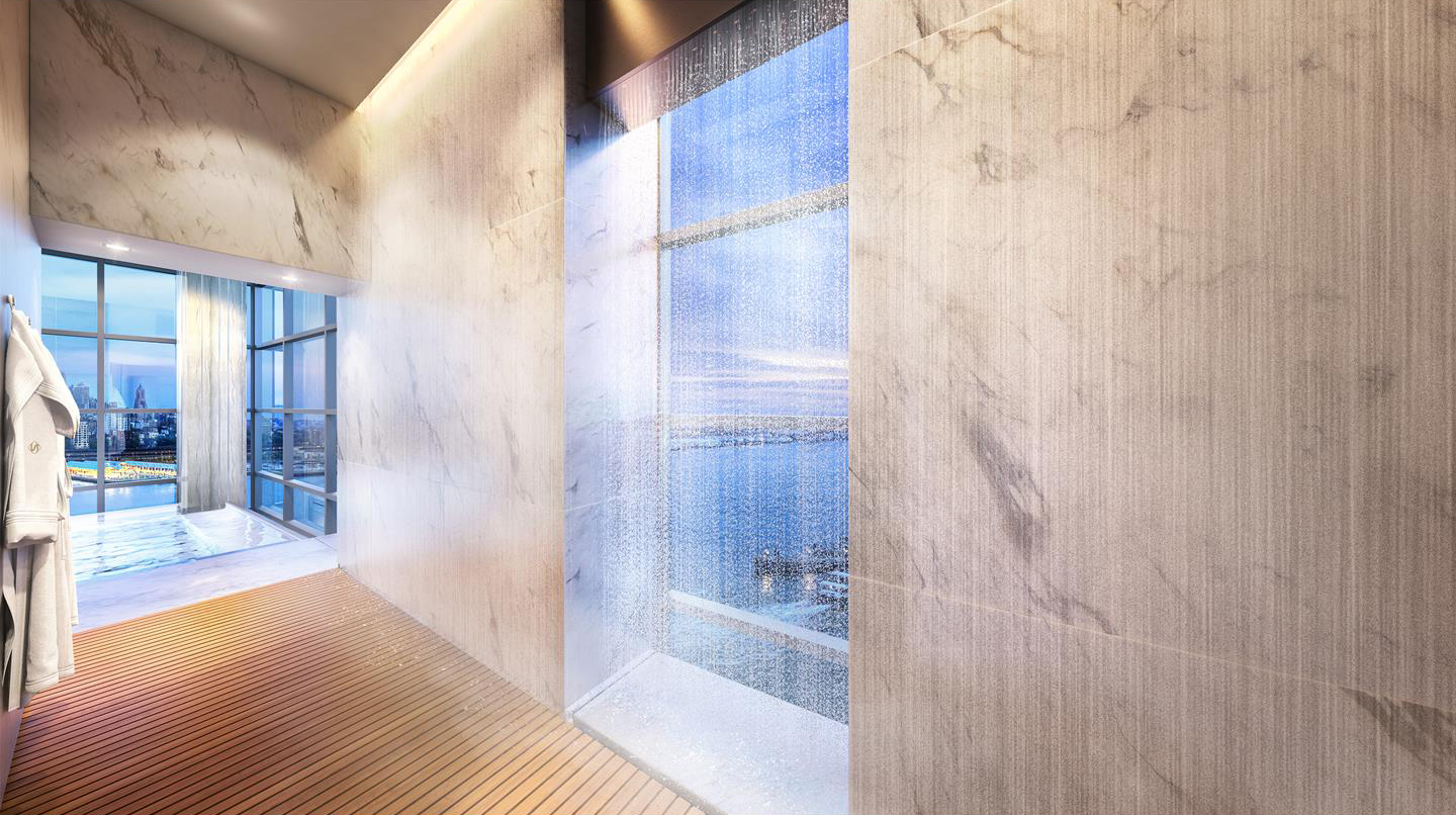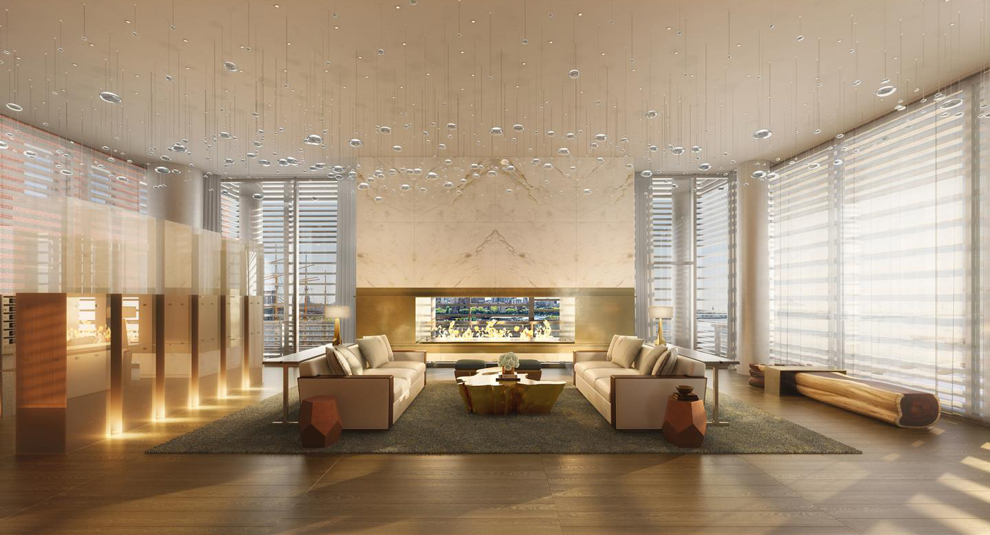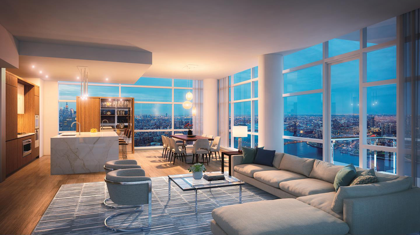 The duplex encompasses nearly 2,000 square feet and features 2 balconies—one off the main living space and another accessible from the master bedroom—that make up an additional 500 square feet. Elevated ceilings and floor-to-ceiling windows maximize the natural light and water views offered by the location. Celebrated designer Russell Groves is responsible for the interiors, which feature European oak flooring, custom architectural millwork and solid wood doors with custom nickel hardware. A custom-designed open kitchen is outfitted with Calacatta Gold marble-clad countertops and cabinets.