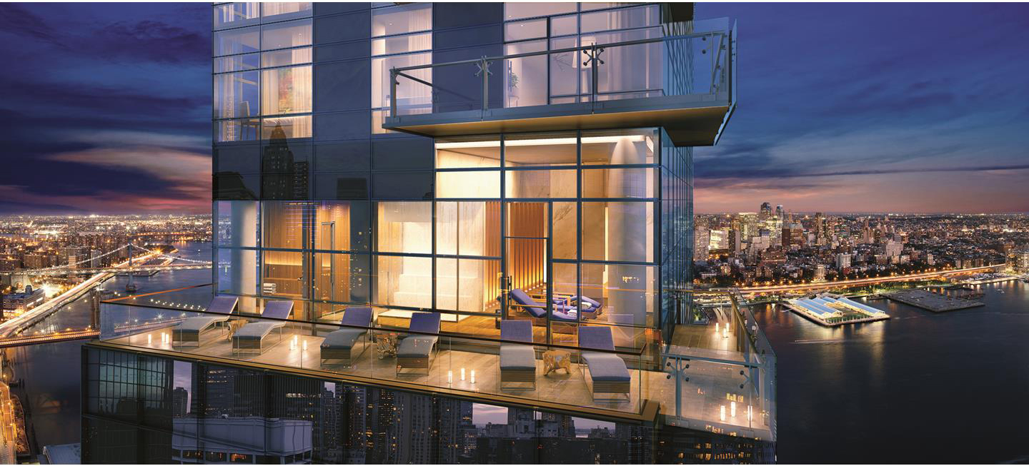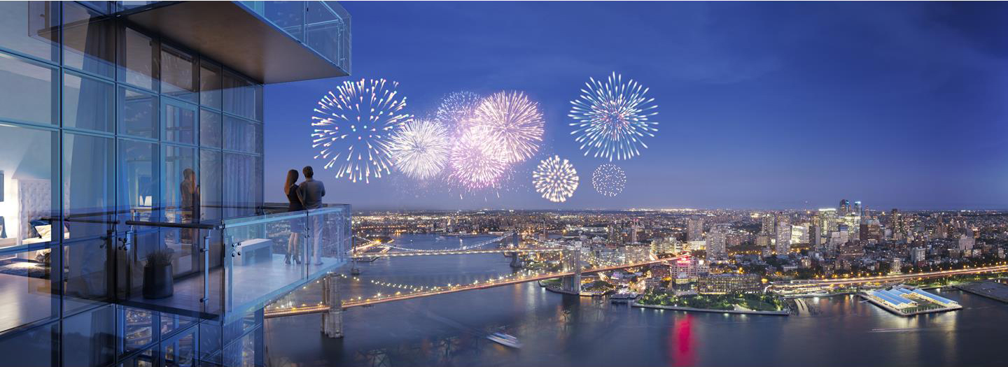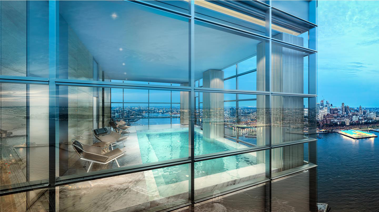 The duplex encompasses nearly 2,000 square feet and features 2 balconies—one off the main living space and another accessible from the master bedroom—that make up an additional 500 square feet. Elevated ceilings and floor-to-ceiling windows maximize the natural light and water views offered by the location. Celebrated designer Russell Groves is responsible for the interiors, which feature European oak flooring, custom architectural millwork and solid wood doors with custom nickel hardware. A custom-designed open kitchen is outfitted with Calacatta Gold marble-clad countertops and cabinets.