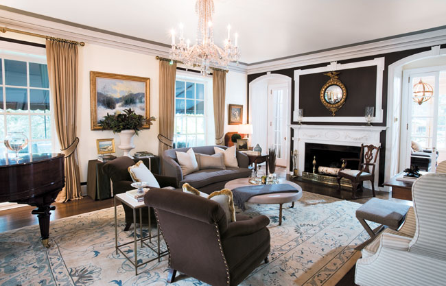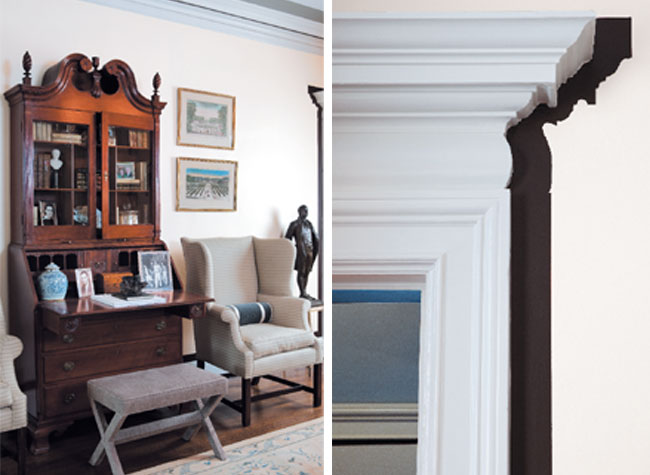 “Since the room is used for official state gatherings, ease of flow into the sunroom and an open, inviting plan were important to the Malloys,” says Bednar Long. Wingback chairs and a Chippendale secretary have moved to the opposing wall for counterbalance. A reupholstered loveseat, along with two custom-made mohair club chairs, a custom ottoman and a new rug now form a more intimate arrangement in front of the hearth. The result? “Though dignified, the room has an undeniable simplicity. It has a warmth and classicism that makes everyone feel well received,” says Bednar Long.