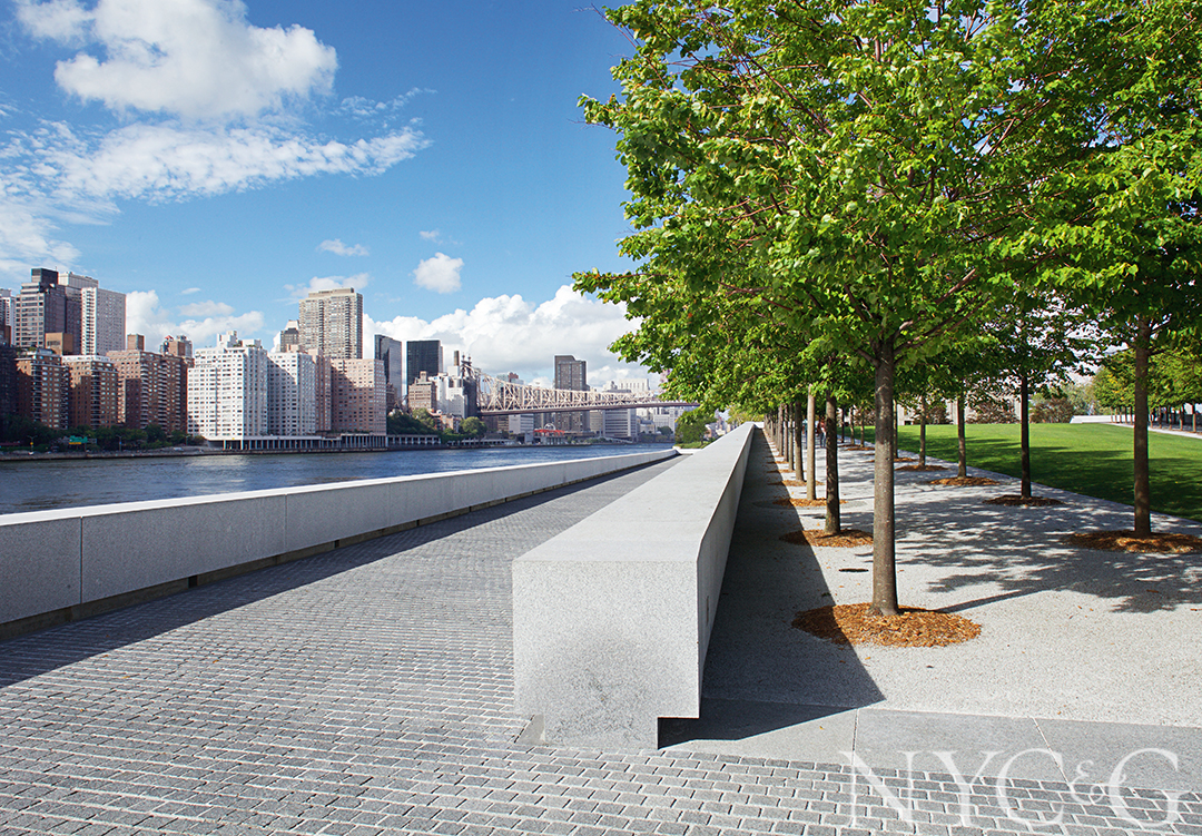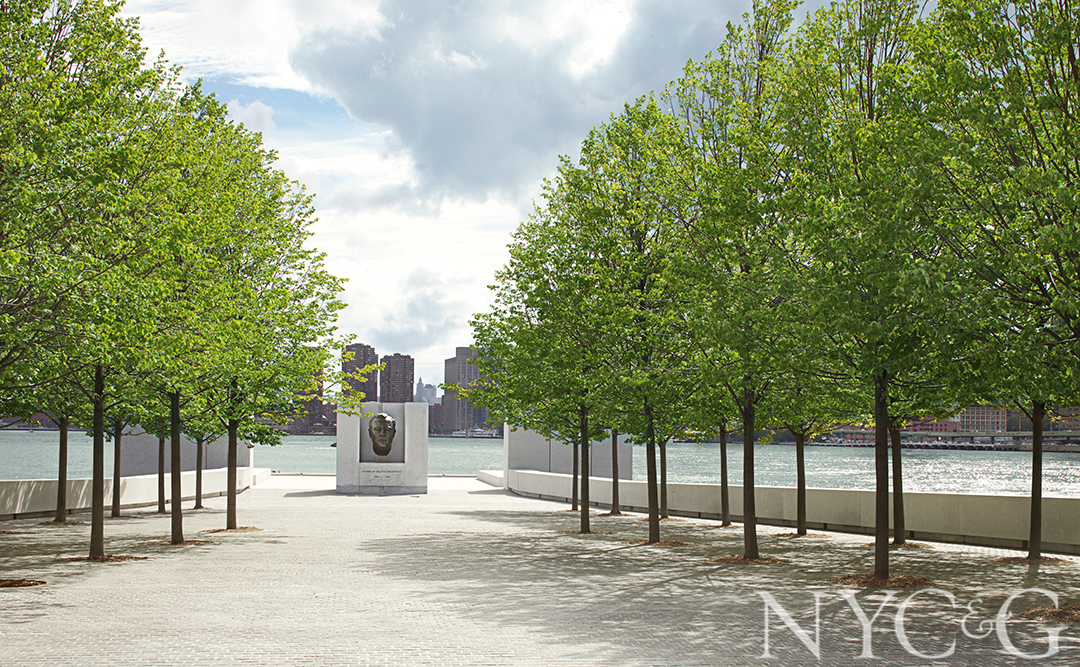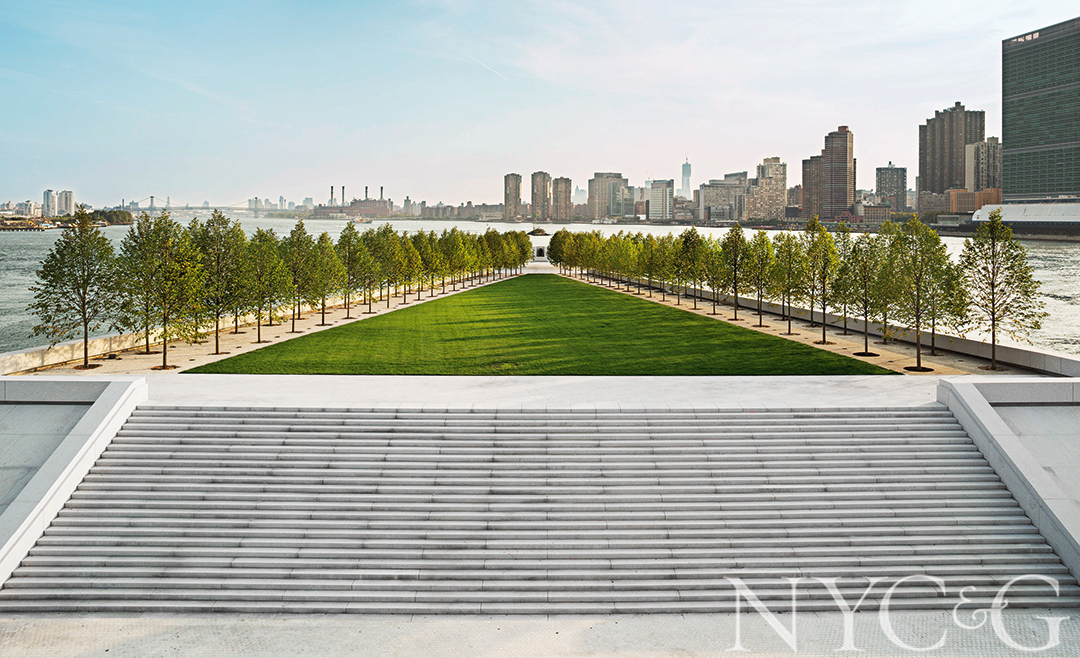 Built on a landfill, the park is approached and amplified by a statement-making granite stairway comprising 100-foot-wide risers. The Roosevelt memorial, positioned at the southern terminus, lies across the river from the United Nations.