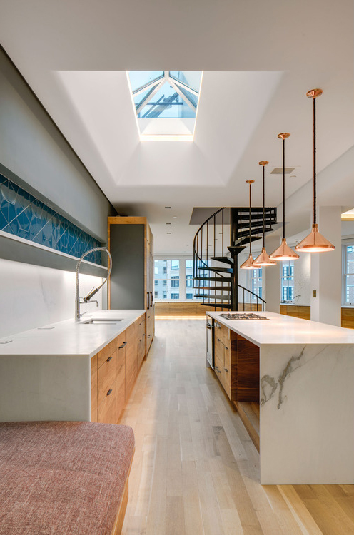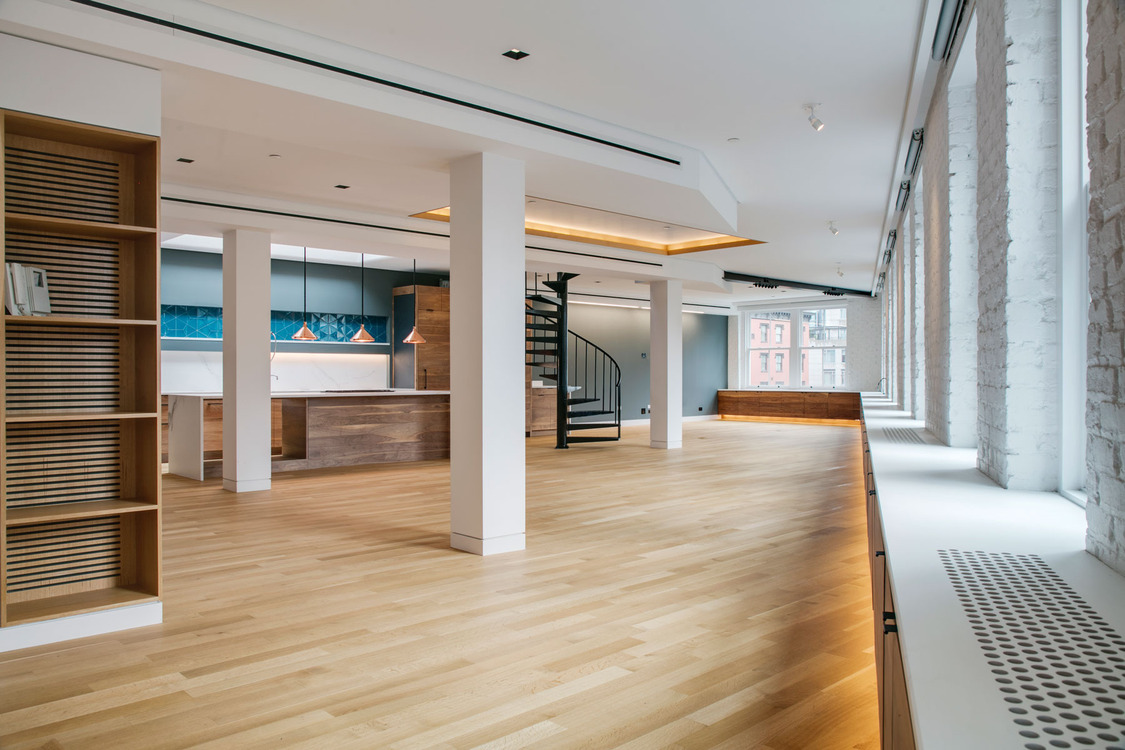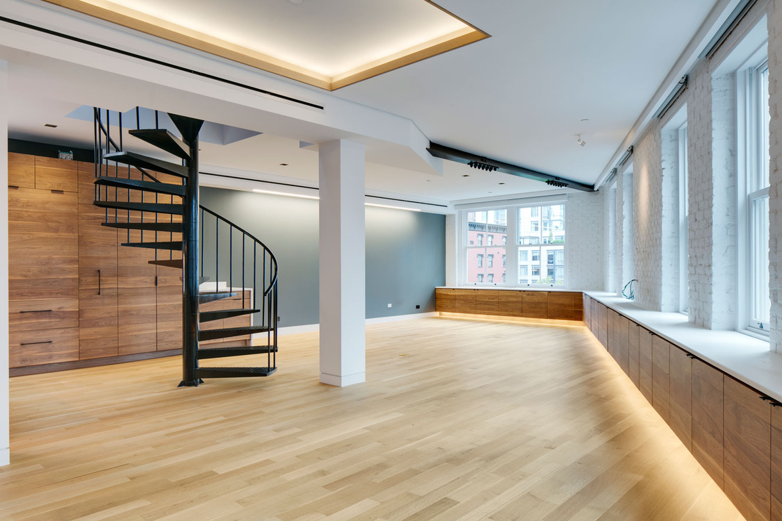 The sprawling corner residence boasts 10 south & west-facing windows that flood the home with sunlight and a gracious amount of entertaining space. It’s currently configured as a 1-bedroom, but the listing touts the home’s flexible layout, which allows for additional windowed bedrooms. The single bedroom includes a walk-in closet and dressing room. Additional features include a chef’s kitchen with a marble-and-wood island and a roof deck accessible by a dramatic spiral staircase.