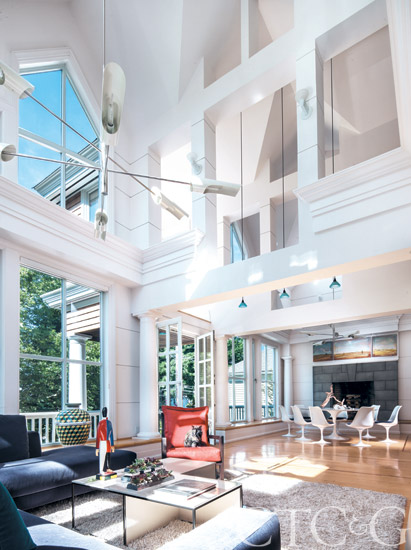 On the second level, she relied on new lighting and more contemporary furnishings to transform the open living space with its 24-foot vaulted cathedral ceilings. “The rooms were once filled with toys and blocks,” says Vlock, who took over the entire upper level to craft an environment in sync with her current lifestyle. Italian seating in the living room, a marble-topped Saarinen table and pedestal “Tulip” chairs in the dining room, and a pair of David Weeks chandeliers combine to reinforce the modern makeover.