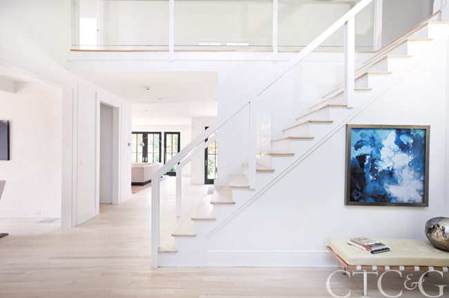 Starting with a traditional living room on the right, dining on the left floor plan, the house features light wood floors, dark framed windows and walls mostly devoid of moldings—the dining room’s sheetrock coffered ceiling being the exception. “It’s a contemporary take on that concept,” explains McNamara, who also introduced a fresh turn on the classic central staircase. “Instead of railings, we used glass so you could look right through it to the family room and to the outdoors.”