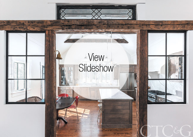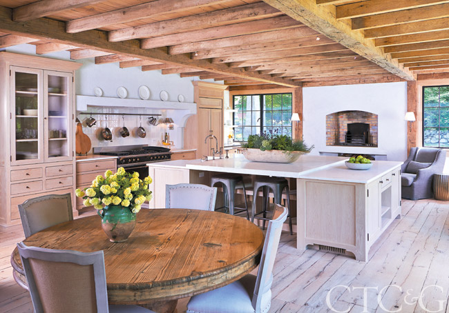 This Fairfield kitchen wears a lot of hats: family room, homework station, bar, TV area, breakfast nook and, of course, food preparation center. “It’s a family kitchen, so that means the whole family can relax there, watch TV, do homework, etc.,” says architect Mark P. Finlay of this addition to an early 20th-century converted barn. “We wanted to ensure that it was open, comfortable and cozy.” Inspired by Flemish design, this highly adaptable space doesn’t feel like a conventional kitchen. Instead, an open floor plan features several functional zones that come together to create one multipurpose space. A large center island serves as a gathering point, room divider and workspace with a Rohl farmhouse sink incorporated across from the La Canche range. A built-in dish cabinet and refrigerator are adjacent to a pantry for additional food storage. Flanking the island are a breakfast area/media center that houses cabinets for office necessities and comfortable seating by the raised hearth, complete with wet bar storage. Character-grade white oak floors, weathered posts and beams and stucco walls unify the space, while expansive windows invite nature inside. “The simplicity of the materials reflects light in an interesting way,” explains the architect. “My favorite part is the feeling of this kitchen—that’s always my goal, to make a room feel great.”
