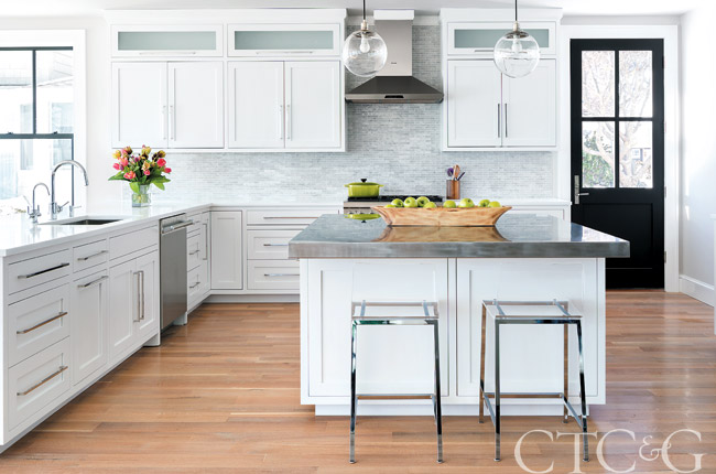 “Who wouldn’t want to do the dishes while staring out at Long Island Sound?” remarks Clean Design’s Claire Paquin, who redesigned a Westbrook summer home to take advantage of its waterfront setting. Part of a whole-house renovation, the kitchen (which previously faced the street, adorned with avocado and chartreuse greens) was reoriented to be the heart of the home. The designer carefully chose materials that wouldn’t compete with the sights. For the countertops, Paquin selected a white quartz that fades into the background and draws the eye out to the water. The island is topped with stainless steel: “It’s important to have this non-precious, hardworking material in a beach house kitchen,” she says. “The focus should be on having fun and hanging out, rather than cleaning and fussing.” In a neutral palette, a wide array of materials adds interest. White painted lacquer cabinetry is decorated with polished stainless hardware, while windows are painted black to emphasize their large scale. “It helps the windows to actually recede and allows your eye to focus outside,” explains Paquin. Lightly pickled, rift and quarter-sawn white oak floors (one of the designers’ favorite elements) provide depth and subtle contrast to the space. Together with a Carrara marble subway tile backsplash, the materials allow the view beyond to take center stage.