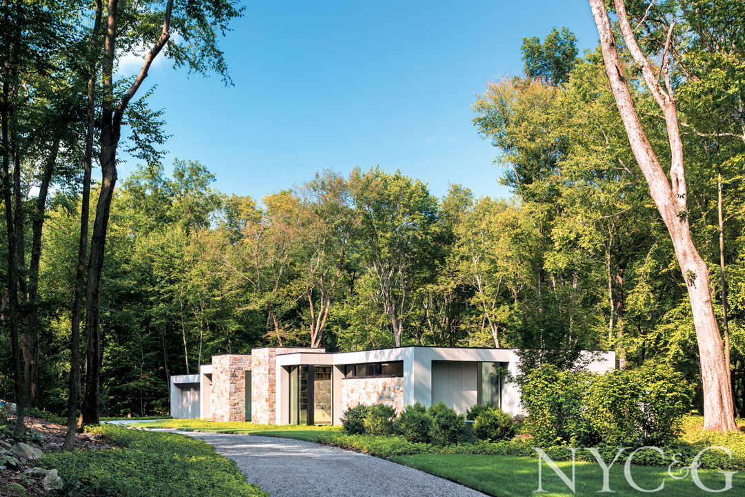 It’s a common goal: A New York City couple wants their weekend home to serve as a tranquil retreat. For this Saugerties residence, Foz Design chose a palette that included wood and locally quarried stone, referencing mid-20th-century modernism while making a distinctive architectural statement. A guest wing contains four bedrooms and remains linked to, but independent of, the house via a glassed-in hallway. Judge Tara Seawright says that the home’s “warm wood exteriors evoke Frank Lloyd Wright’s Fallingwater, creating a relaxing first impression.”