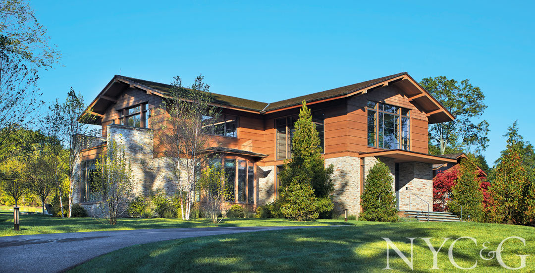 The challenge for the architects of this new home in Scarsdale was to create a spacious residence that respected its more modestly scaled neighbors. Principal Radoslav Opacic reduced the visual heft of the home by using shallow-pitched, broad roof lines and red cedar eaves, and built it on two axes—an east-west one for public spaces and a north-south one for private areas. Judge Alan Tanksley admires the house’s “references to the architecture of Greene and Greene. It’s organic, mannered, and livable,” he says.