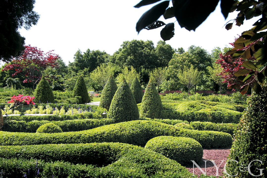 When landscape architect John Conte toured this Armonk property, he was confronted with a blank lawn, something that seemed anathema to the early-20th-century estate overlooking Long Island Sound. Known as the Ledges and Soundview Manor, it featured everything a major European-style spread should have, except a formal garden. Accordingly, Conte created outdoor rooms defined by walled hedges, formal axes, and a sunken rose garden with custom-made wrought-iron arches.