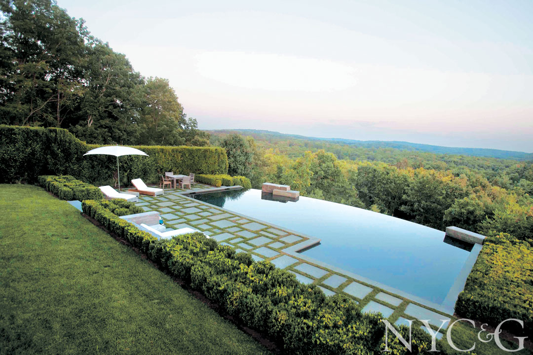 The moment the owners saw this Bedford Hills home and property, they envisioned an infinity pool, preparations for which began with the removal of a line of trees, thereby opening up views to an expansive valley beyond. The chief building blocks are hand-hewn bluestone slabs, whose forms and colors are further enhanced by minimal plantings around the pool itself.