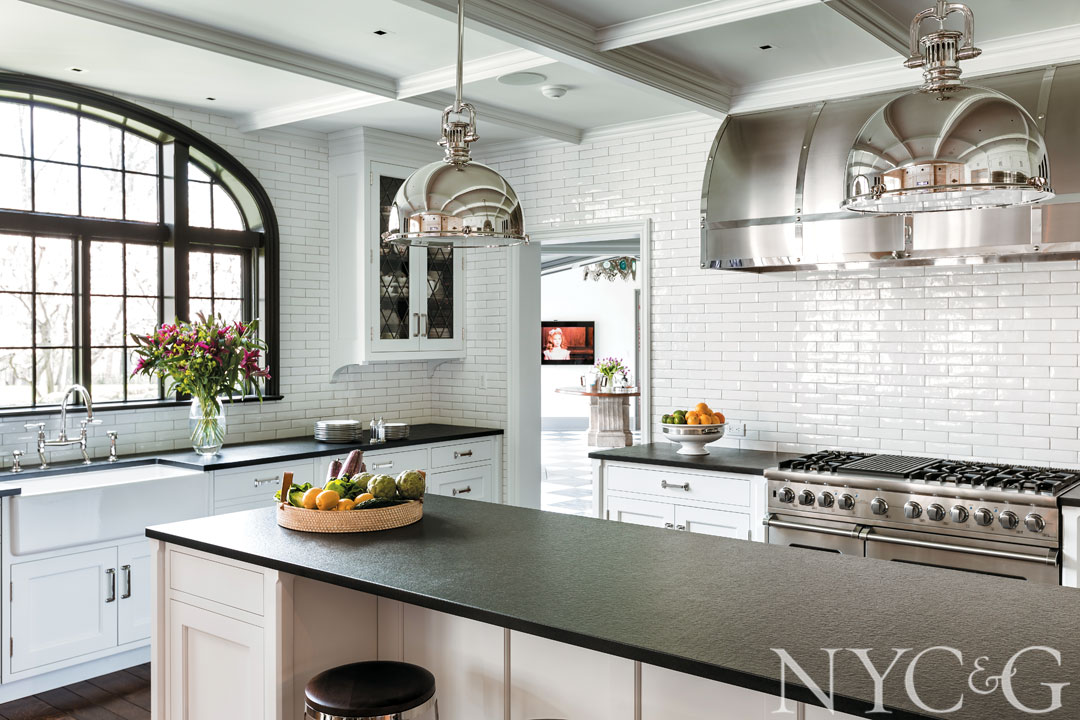 Although Alan Tanksley likens this Tudor-style space in Westchester “to a staff kitchen in a great manor house,” it’s used daily by a family that likes to entertain. In keeping with the house’s Tudor lines, Alisberg Parker painted the cabinets white to establish a contrast with the dark wood floors and the cerused oak woodwork in the adjacent great room. Extra points: two islands—one for casual dining, the other for food preparation—as well as a custom-designed hood that references Tudor forms.
