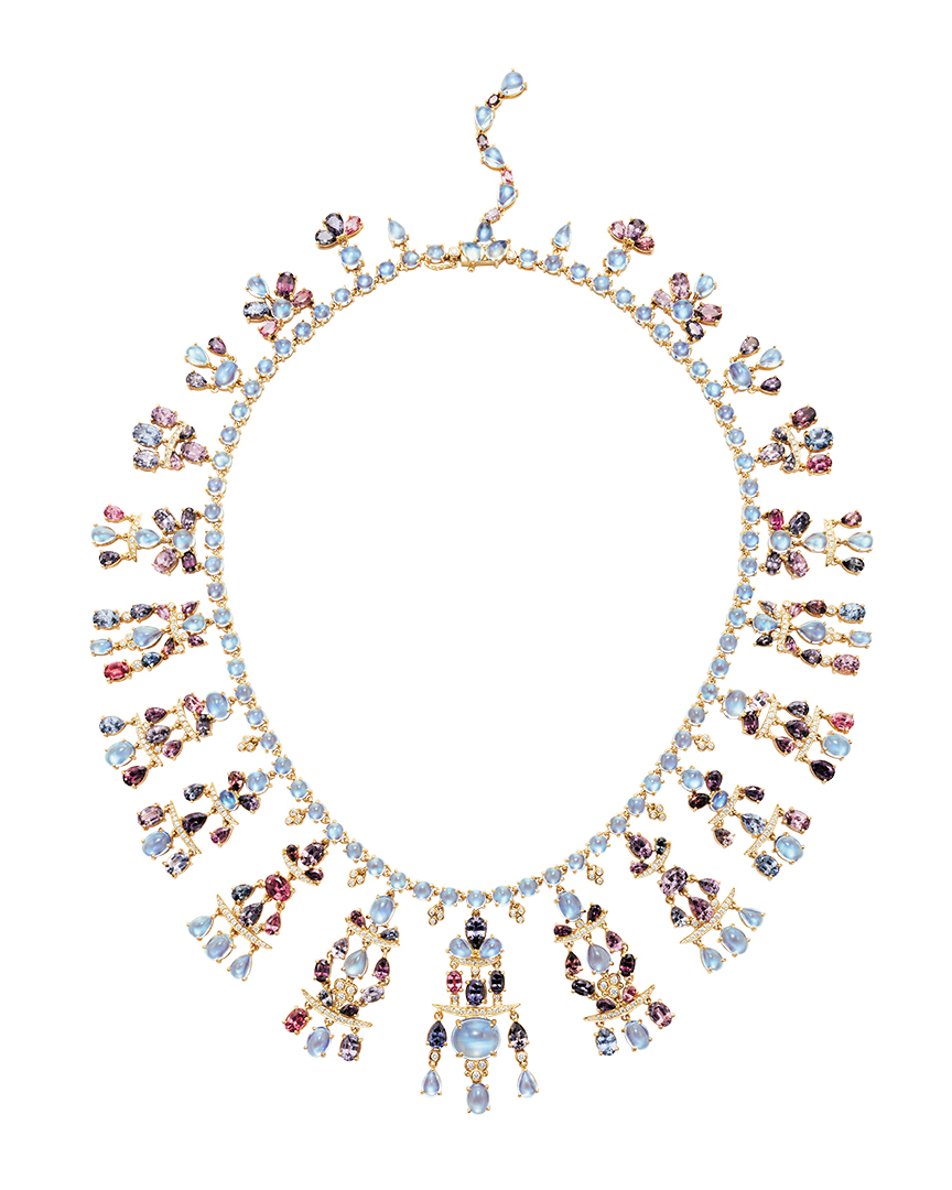 Her new collection was inspired by a journey along the Silk Road. “I feel like I’ve been on the Silk Road all my life, filling in all the missing parts along the way,” she says. Noting a stop at the Buddhist cave temples in Dunhuang in far western China, St. Clair explains the Silk Road was not only a merchant road: “It was literally a spiritual path.” This collection is a metaphysical journey on which her designs “make their way through the desert to Persia, and then become colorful when you hit the oasis, and arrive at last in Dunhuang.” The jewels are inspired by Buddhist cave murals and are interpreted in Chinese and Oriental shapes. Her current fascination is with spinels. “The stones are very painterly, almost like watercolors,” says St. Clair, who feels she is “painting with gemstones.” Her favorite new piece is the Seta Moon necklace: “It makes me think of the murals I saw; it transports me to another place and time and style.”