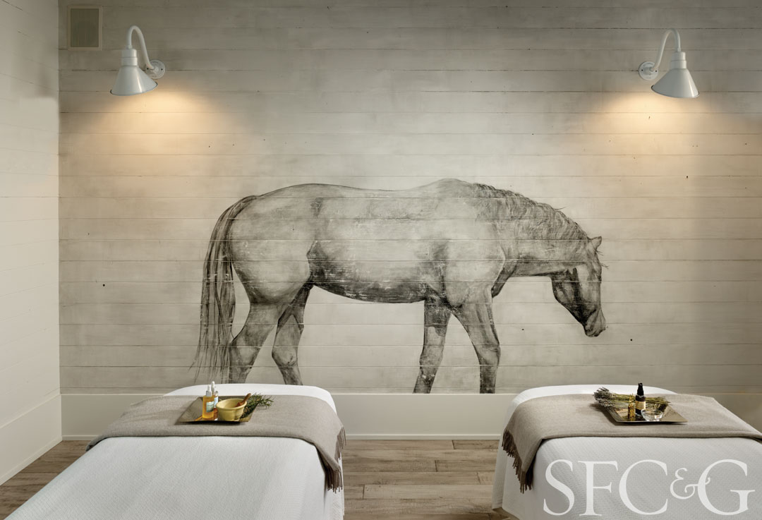 Along the main hall, a succession of four “stalls” serve as treatment rooms, complete with hand-drawn equine murals by local artist Tina Wainwright. Continuing the play on equestrian life, each room also features a body pillow filled with fragrant herbs and alfalfa used in the spa’s Roll in the Hay treatment. And when the massage or facial is complete, guests can retire to their individual, private outdoor space with chaise longue and shower, perfect for reclining and relaxing under the wine-country sun. Adds Smith, “The rooms face out to the western hillside, which adds to the bucolic atmosphere.”