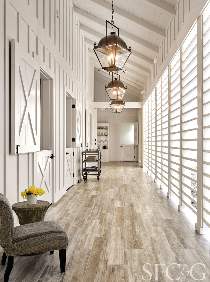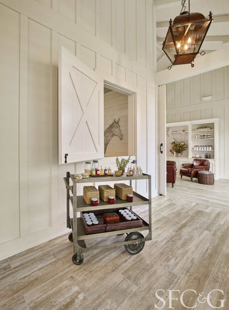 Drawing on farmhouse vernacular, San Francisco’s SB Architects designed a modern stable to house the new spa. The firm designed a dramatic 16-foot peaked roof, a sliding barn door at the entry to the treatment area and a charming Dutch door to front the reception room. A slatted wall along the main passage also creates a breezeway that keeps the spa divinely connected to the outdoors. Hoefer’s selection of clean white beadboard for the walls and cabinetry completes its rustic-chic look.