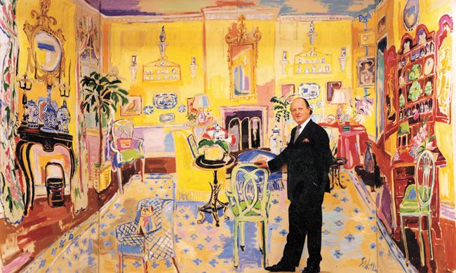 Interior designer Mario Buatta, pictured against an illustrated backdrop by Sander Witlin, grew up in Livingston Heights, Staten Island, and became celebrated as the “Prince of Chintz,” decorating homes and apartments for everyone from Barbara Walters to Mariah Carey. “My mother and I used to drive around Staten Island and New Jersey just to gaze at houses,” he recalls of his childhood.