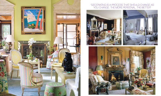 (Left) Buatta painted the 36-foot-long double-height living room in Hilary and Wilbur Ross’s New York pied-à-terre apple green and added the overdoor pediments; the painting is by Ivan Godlevsky. (right, clockwise from top left) In the Rosses’ previous residence on Fifth Avenue, he chose eggplant for the living room walls, “a great color on which to display paintings, and at night it reflects the city lights.” A star-studded gauze canopy in the same apartment’s master bedroom lends even more urban dazzle. Buatta employed glazed red walls and a Christopher Norman chintz for the curtains and seating pieces in the sitting room of a 1920s country house in Centre Island, New York.