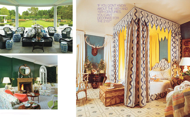 At Hilary and Wilbur Ross’s summer home in Southampton (top left), Buatta created a mirror-image arrangement of dual seating areas studded with wicker and bamboo pieces and ceramic garden stools. Walls lacquered and glazed in a spinach-green crisscross pattern anchor an airy arrangement of three discrete seating areas in a living room in Bedford, New York (bottom left). For a 1976 showhouse in Morristown, New Jersey, Buatta complemented the master bedroom’s denim-glazed walls with Pierre Frey’s toile de Nantes on the tester’s curtains and headboard, adding an interior jolt of yellow for contrast (right). The mounted stag head and the floor, hand-painted to resemble an American quilt, add further whimsy to the space.