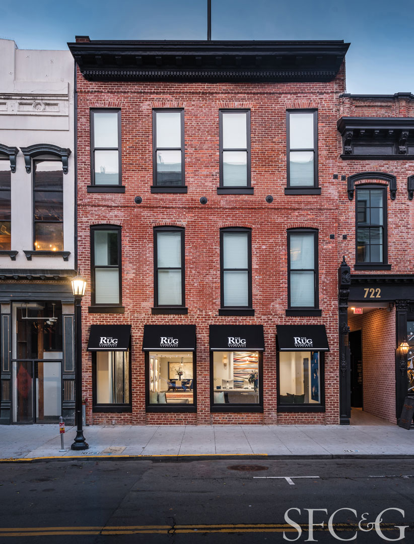 The Belli building had a wonderfully spicy history as a Turkish bath, Barbary Coast theater and tobacco warehouse. In 1959, it began a more legitimate existence as the offices of attorney Marvin Belli. After Belli’s passing, the property sat empty for years, until it was transformed by a new owner into a mixed-use property with retail and residential space. In May of last year, the Rug Company leased the ground floor and, working with San Francisco architect Steve Geiszler, undertook a retrofit and design improvements to create a glorious new showroom.