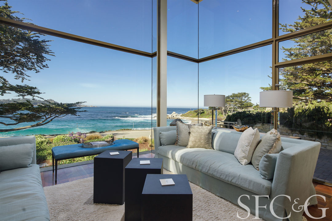 Set right on the beachfront, this Carmel-by-the-Sea home enjoys an endless ocean view: The panorama stretches across Stewart’s Cove beyond to Point Lobos in the distance. Substantially refreshed in 2012 with new expanses of glass that showcase its spectacular vistas, this three-bedroom property is listed for $11 million with David Kent at Alain Pinel.