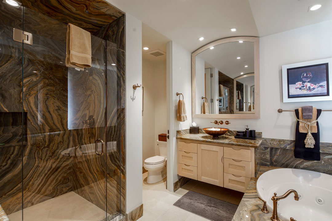 The luxurious master bathroom is lined with marble.