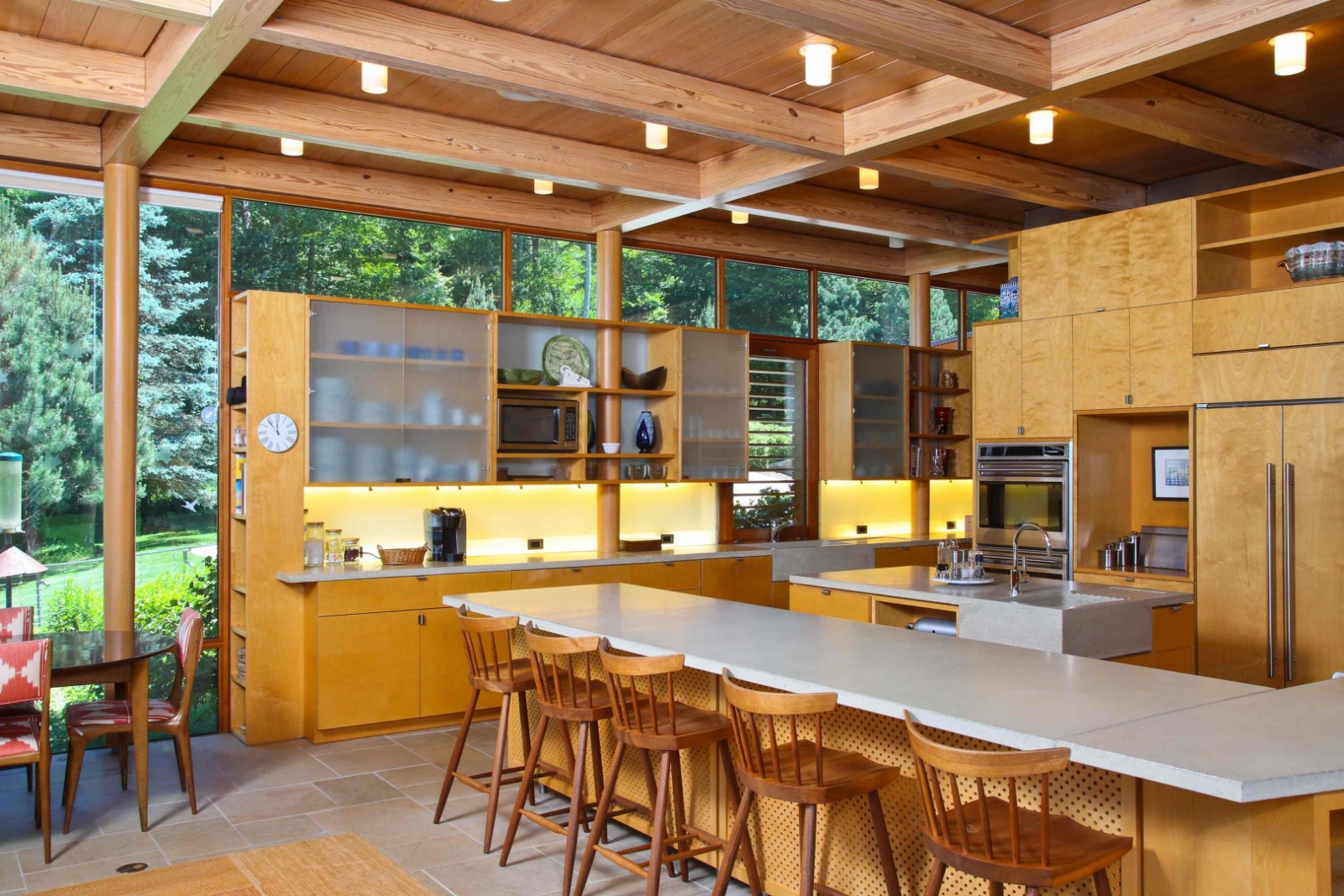 A glass wall floods the dining room with light.