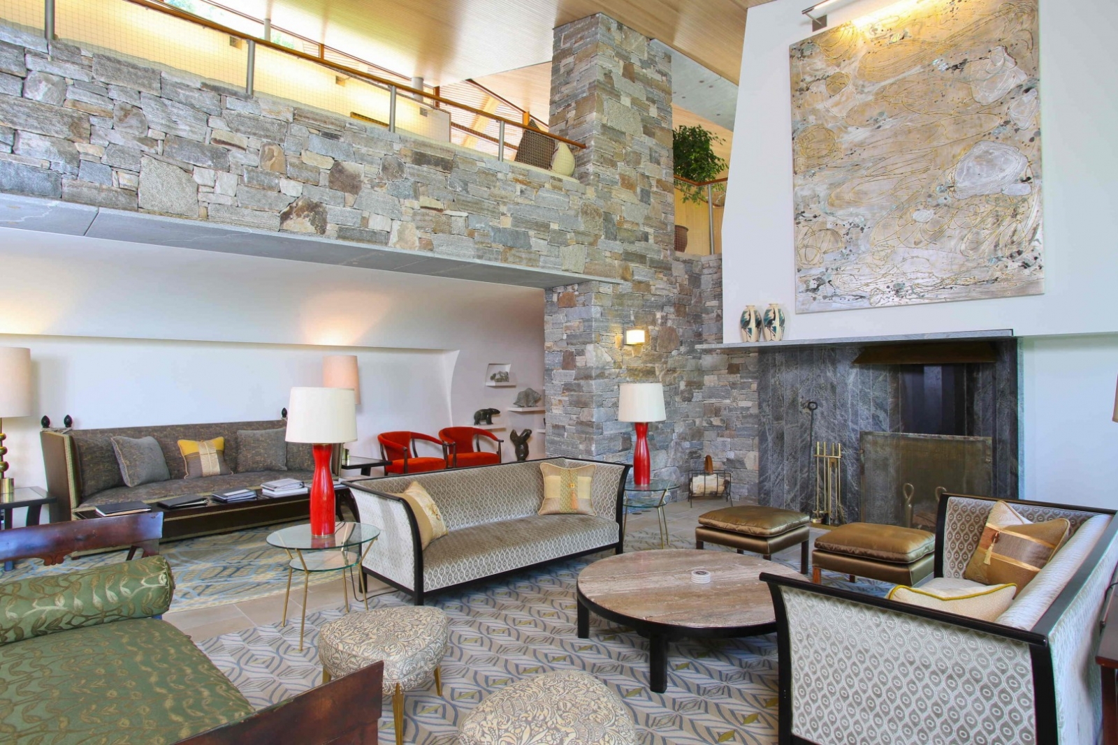 The double-height living room features a dramatic stone wall.